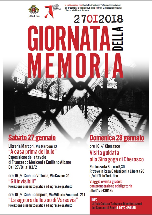 In occasione del Giorno internazionale della Memoria, la Città di Bra ricorda le vittime dell’Olocausto con una serie di iniziative rivolte alla cittadinanza, occasione per riflettere, approfondire e non dimenticare l’indicibile tragedia della Shoah.