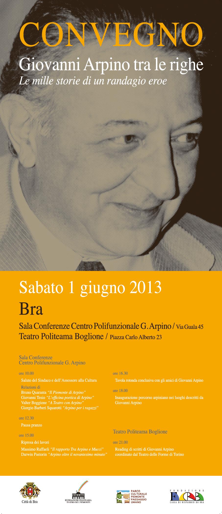 Sabato 1 giugno un convegno – a 25 anni da quello organizzato, sempre a Bra, un anno dopo la morte dello scrittore – porterà sotto la Zizzola giornalisti, amici, uomini di cultura che, per un giorno intero, ripercorreranno la figura di Arpino con testimonianze, studi e relazioni. “Giovanni Arpino fra le righe. Le mille storie di un randagio eroe”, questo il titolo del convegno, prenderà il via alle 10 al centro culturale polifunzionale che dello scrittore porta il nome, in via Guala 45. Dopo il saluto del Sindaco, al via le relazioni, con il giornalista Bruno Quaranta che racconterà “Il Piemonte di Arpino”, il critico letterario Giovanni Tesio e “L’officina poetica di Arpino”, il docente universitario Valter Boggione con “A Teatro con Arpino” e il critico e poeta Giorgio Barberi Squarotti che esplorerà l’“Arpino per ragazzi”. I lavori riprenderanno dopo il pranzo: alle 15 il docente e filologo Massimo Raffaeli parlerà de “Il rapporto tra Arpino e Mucci”, seguito dal giornalista Darwin Pastorin, che traccerà un quadro di “Arpino oltre il novantesimo minuto”. Il convegno si concluderà alle 16.30, con una tavola rotonda alla presenza degli amici di Giovanni Arpino. La giornata prosegue con l’inaugurazione del percorso Arpiniano, alle 18, tour tra i luoghi descritti nei romanzi più famosi dell’autore, per chiudersi alle 21 al Teatro Politeama Boglione di piazza Carlo Alberto, con il reading di scritti di Giovanni Arpino, in uno spettacolo ad ingresso gratuito realizzato in collaborazione con il Teatro Delle Forme di Torino.