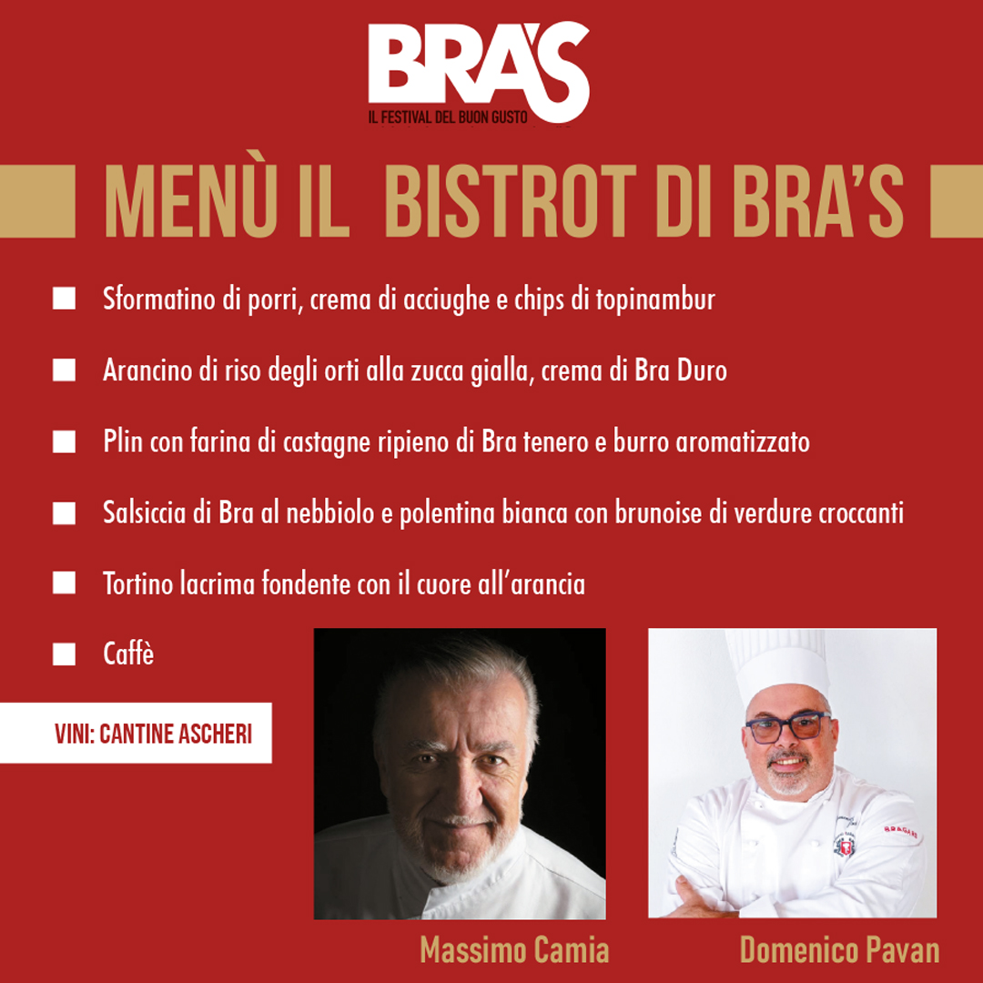 Il secondo appuntamento a tavola, prima del weekend a porte aperte, è in programma venerdì 10, alle 20.30 al Movicentro, dove verrà allestito il Bistrot di BRA’S: una collaborazione tra lo stellato Massimo Camia e lo chef de “Il Banchetto” Massimo Pavan, per una cena gourmet alla portata di tutti, con i piatti della tradizione e i prodotti dell’eccellenza.