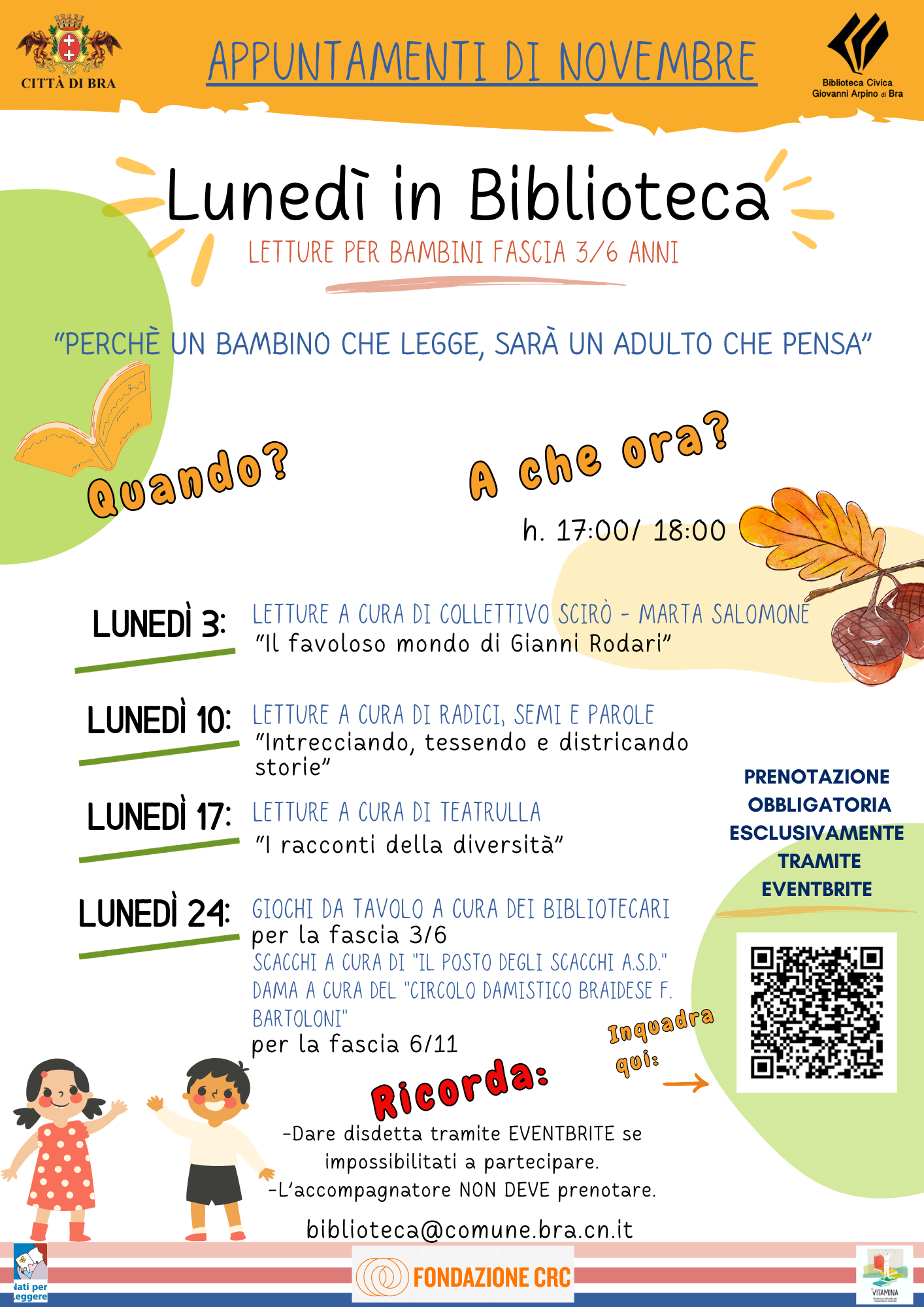 Proseguono anche nel mese di novembre gli appuntamenti alla Biblioteca civica “Giovanni Arpino” di Bra dedicati agli appassionati della lettura, soprattutto i più piccoli.