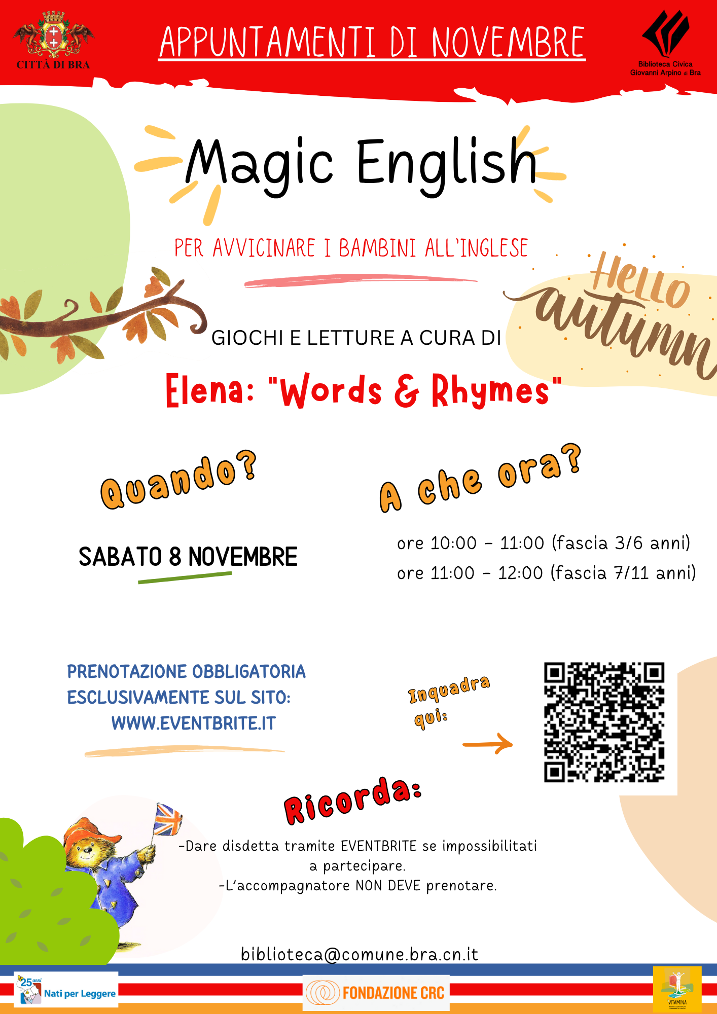 Sono invece in programma per sabato 8 novembre le letture in lingua inglese di Magic english a cura di Elena: Words and Rhymes. Si terranno due laboratori rispettivamente alle 10 per i bimbi 3-6 anni e alle 11 per la fascia 7-11 anni. Anche gli appuntamenti in lingua sono ad ingresso gratuito con prenotazione obbligatoria sulla piattaforma www.eventbrite.it.