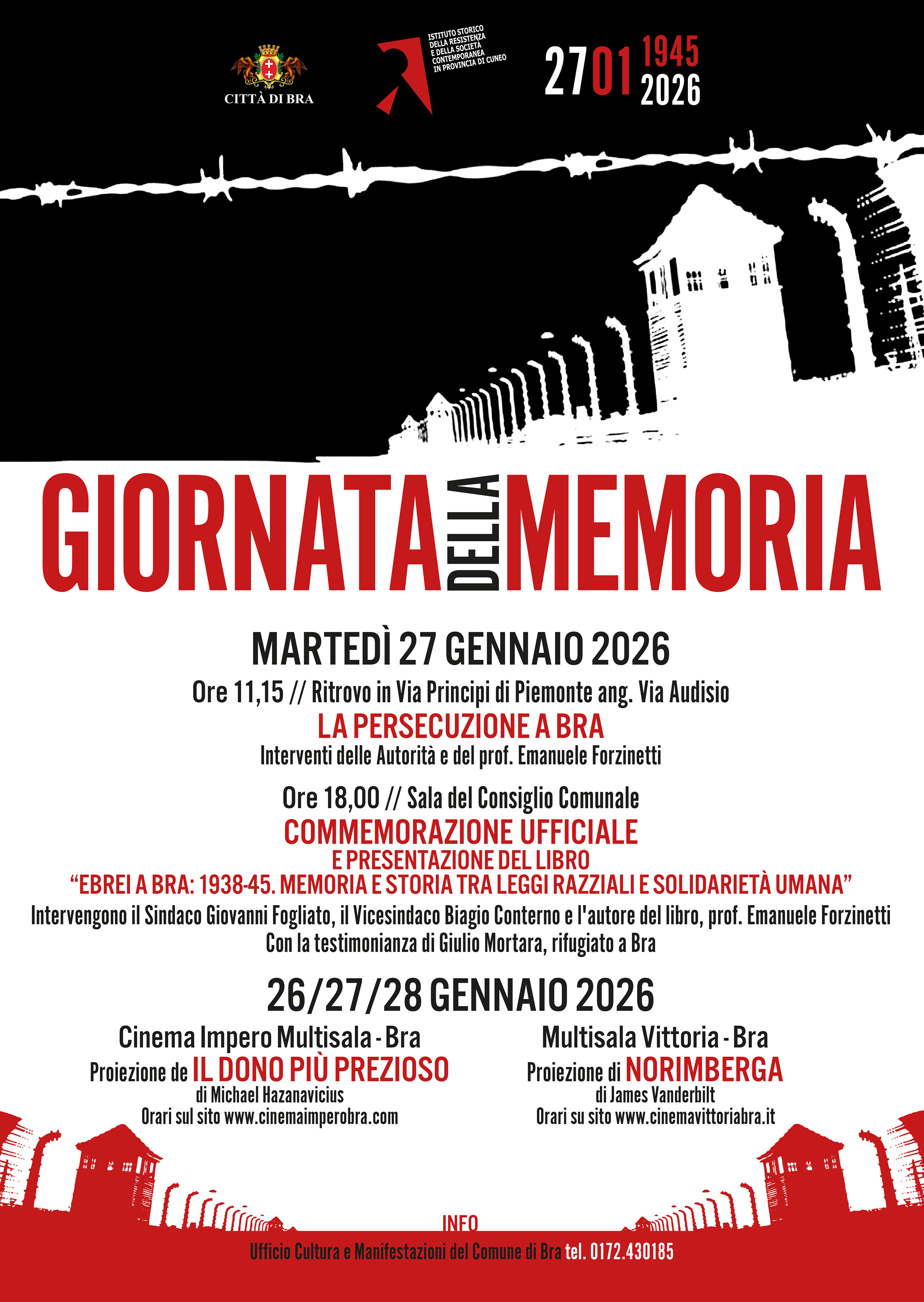 Le iniziative del Giorno della Memoria sono organizzate dal Comune di Bra in collaborazione con l’Istituto storico della Resistenza e della Società contemporanea di Cuneo. Maggiori informazioni presso l’Ufficio Cultura e Manifestazioni (0172.430185 – turismo@comune.bra.cn.it ).
