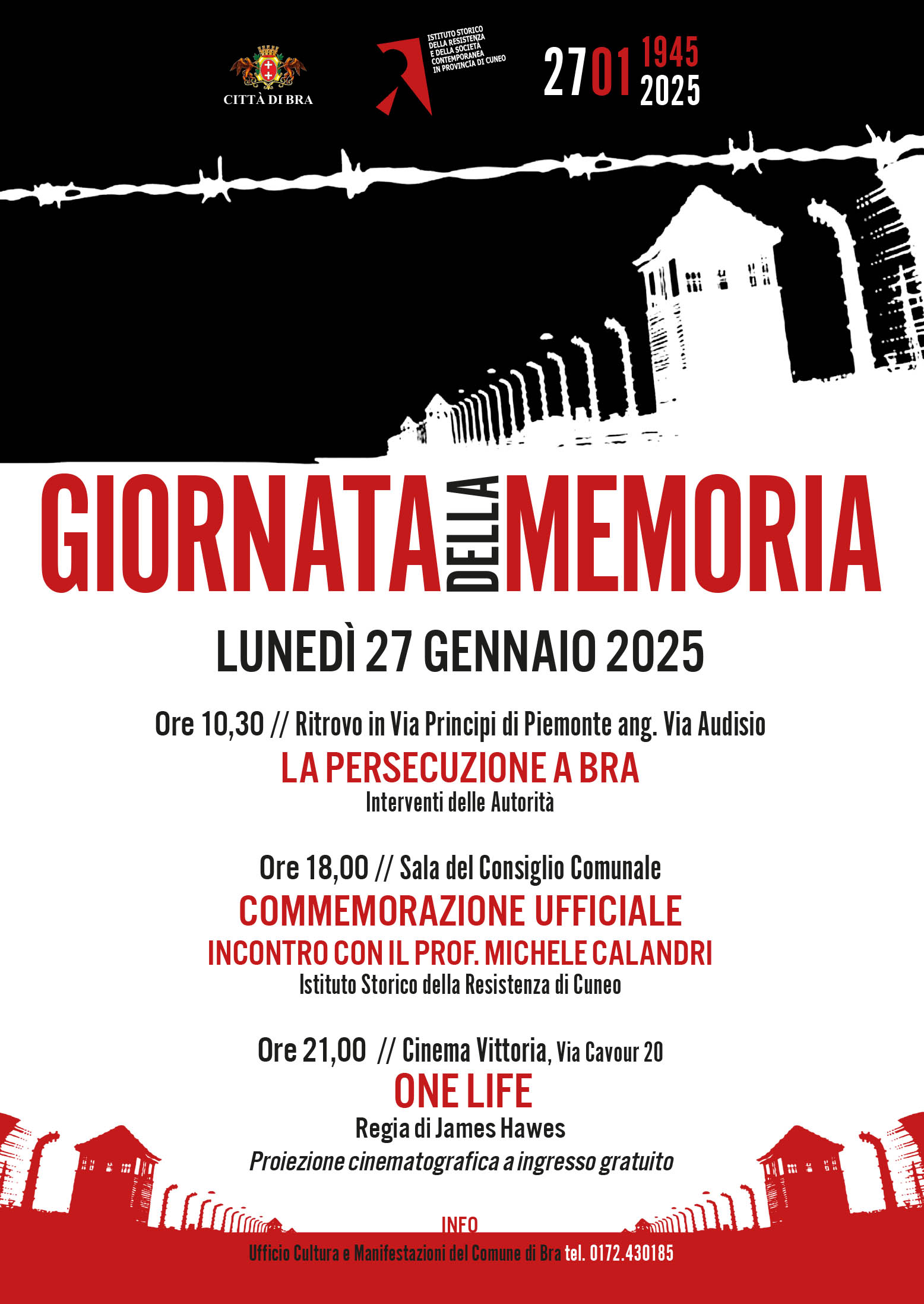 Lunedì 27 gennaio 2025 la Città di Bra celebra la Giornata della Memoria, ricorrenza internazionale in occasione della quale vengono ricordate le vittime dell’Olocausto nella stessa data in cui, nel 1945, i soldati sovietici arrivarono nella città polacca di Auschwitz, scoprendo l’enorme campo di concentramento e sterminio utilizzato nel corso del genocidio nazista.