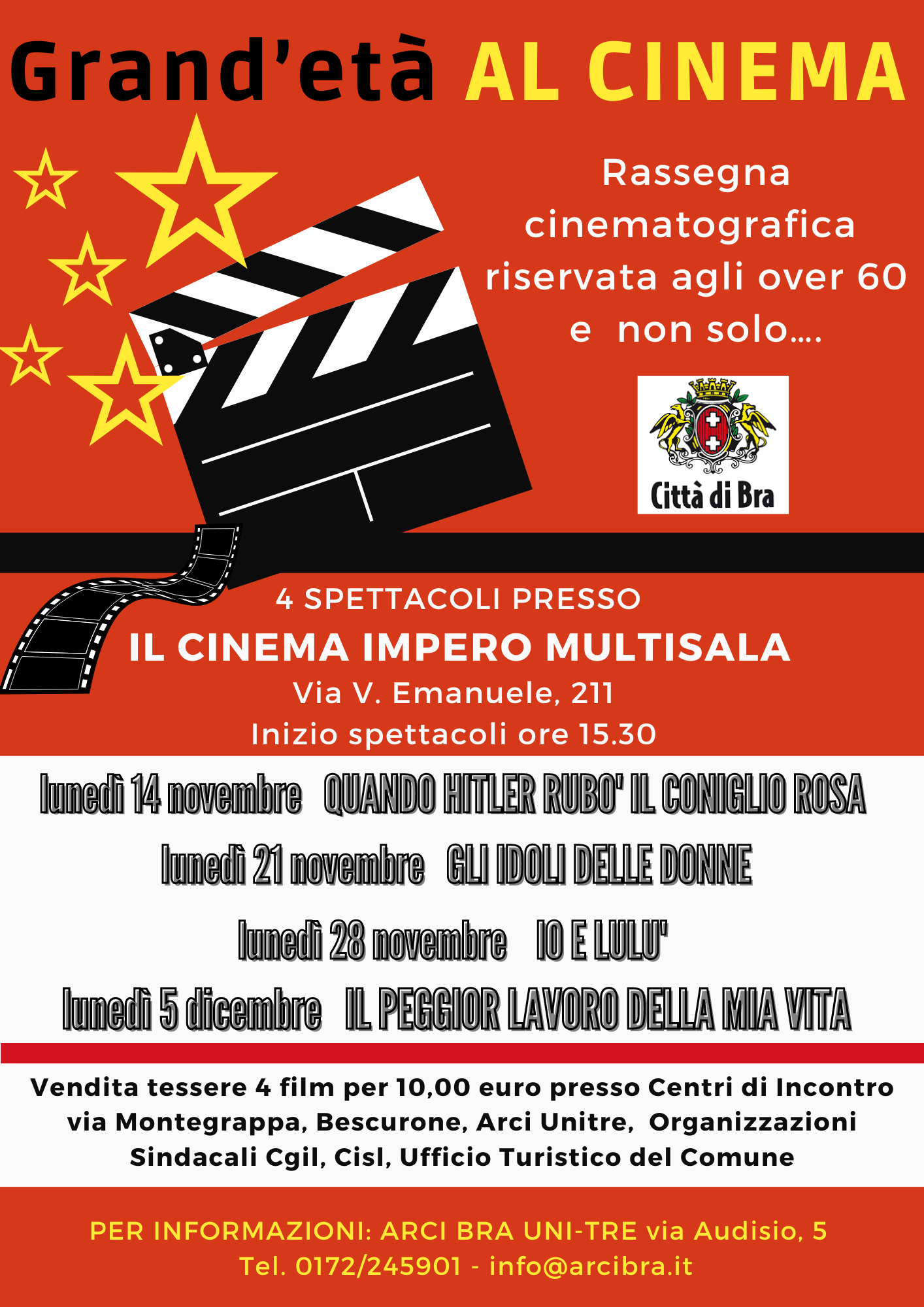 È uno degli appuntamenti più attesi dagli over 60 di Bra. Si tratta di “Grand’età al cinema”, la rassegna cinematografica che consente di gustarsi quattro film con un unico abbonamento scontato da 10 euro. Le pellicole sono in programmazione il lunedì pomeriggio dal 14 novembre al 5 dicembre 2022, alle 15.30, presso la Multisala Impero di via Vittorio Emanuele 211.