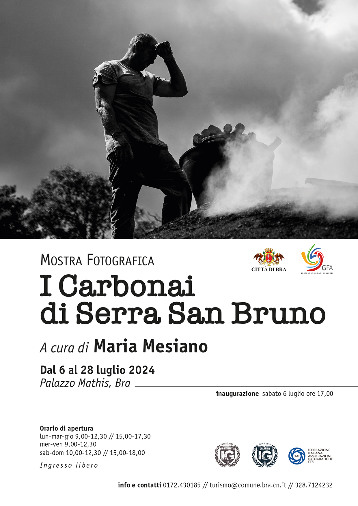Dal 6 al 28 luglio 2024 Palazzo Mathis ospita l’esposizione fotografica “I carbonai di Serra San Bruno” di Maria Mesiano. Insegnante di origine capistranese, la Mesiano vive a Cherasco da più di vent’anni e lavora a Bra come maestra presso la scuola primaria Edoardo Mosca. La fotografia è la sua grande passione.