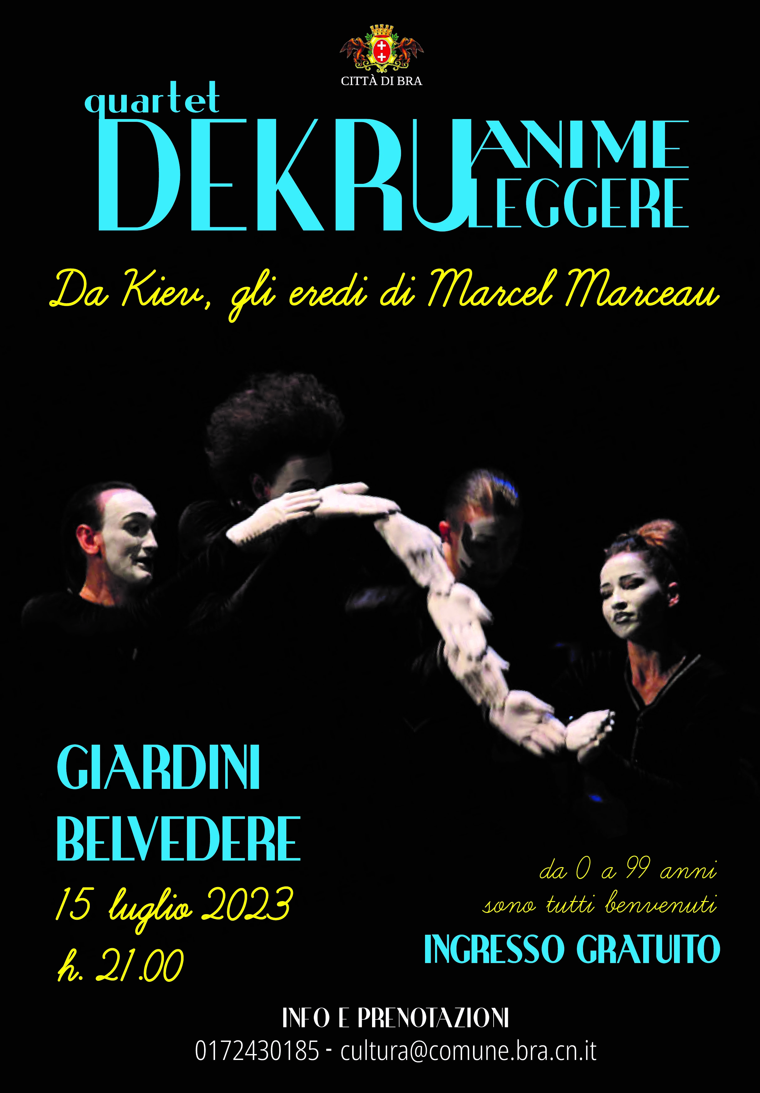 Tre attori e un’attrice completamente vestiti di nero, con la faccia dipinta di bianco: il quartetto Dekru esprime l’archetipo del teatro, utilizzando la potenza iconica della figura del mimo per regalare al pubblico una serata di emozioni. Nel corso dello show, che si inserisce all’interno della rassegna di eventi estivi curata dal Comune di Bra, sabato 15 luglio ai Giardini del Belvedere di Bra, ore 21, appariranno numerosi personaggi originali, dando vita, con il solo uso del corpo, a una serie di scene che raccontano le vicissitudini dell’essere umano. Lo spettacolo è a ingresso libero fino a esaurimento posti.