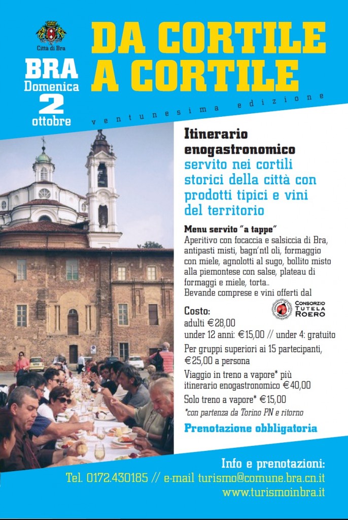 Per partecipare all’evento è necessario prenotare i biglietti (intero 28 euro, ridotto a 25 euro per gruppi superiori a 15 persone e a 15 euro per gli under 12) all’ufficio Turismo e Manifestazioni del Comune di Bra, al numero 0172.430185 oppure all’indirizzo e-mail: turismo@comune.bra.cn.it. Sarà possibile raggiungere Da Cortile a Cortile anche con un suggestivo treno a vapore, in partenza da Torino: tutte le info qui.