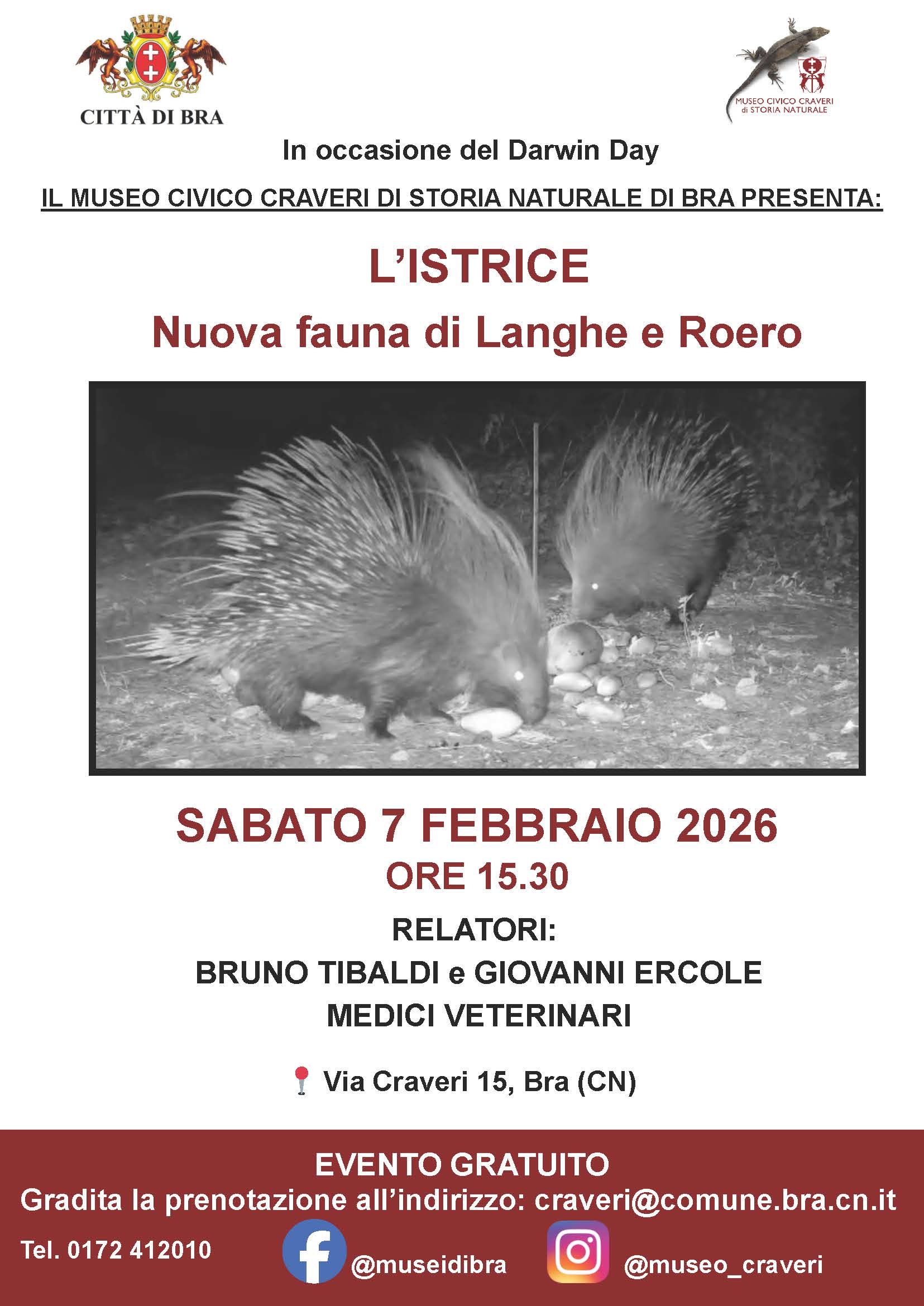 In occasione del Darwin Day – le celebrazioni per la nascita del celebre biologo Charles Darwin, divenute occasione per promuovere l’impresa scientifica – il Museo civico Craveri di storia naturale organizza per sabato 7 febbraio 2026 una conferenza dal titolo “L’istrice. Nuova fauna di Langhe e Roero”. L’appuntamento, in programma presso i locali di via Craveri 15 a partire dalle 15,30, vedrà come relatori i medici veterinari Bruno Tibaldi e Giovanni Ercole.