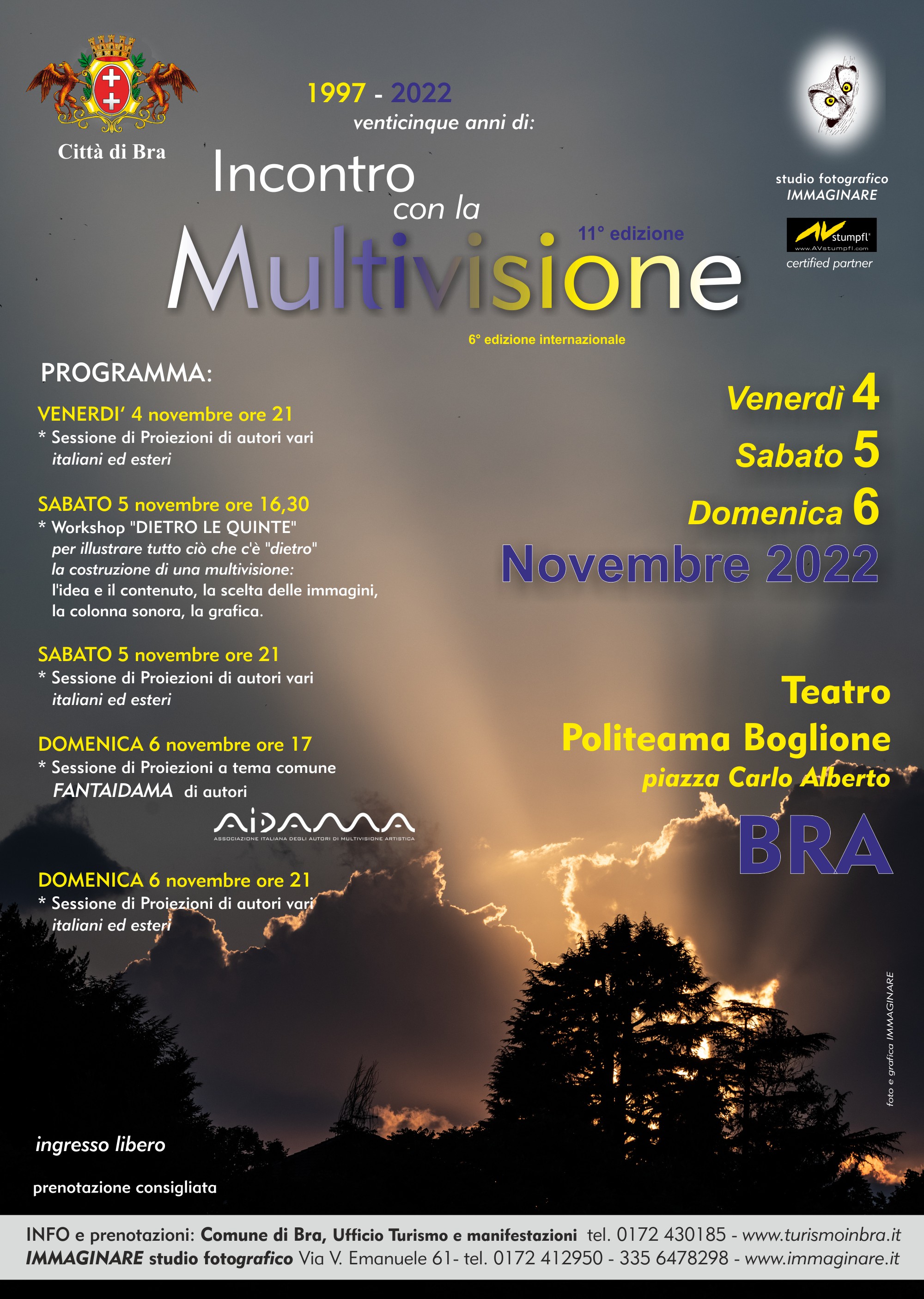 Torna a Bra “Incontro con la Multivisione 2022”, prima rassegna di multivisione del Piemonte, in programma da venerdì 4 a domenica 6 novembre 2022 al Teatro Politeama Boglione di Bra. Nata nel 1997, ha ospitato sinora i migliori artisti italiani e stranieri, iscrivendo nel proprio curriculum alcuni tra i maggiori esponenti a livello mondiale di questa affascinante forma di espressione artistica.