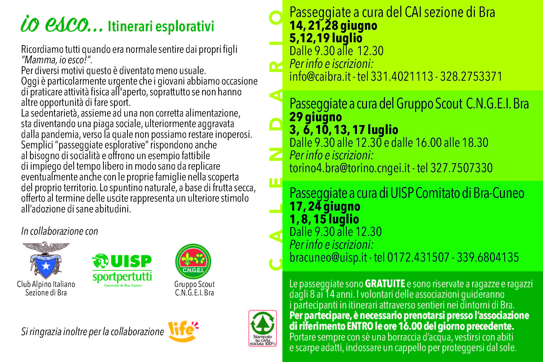 Un programma di passeggiate all’aria aperta in compagnia dei propri coetanei, riscoprendo la natura, il piacere di un sano movimento e il nostro meraviglioso territorio. E’ l’obiettivo di “Io Esco…Itinerari esplorativi”, iniziativa promossa dal Comune di Bra e dall’Università di Scienze Gastronomiche di Pollenzo in collaborazione con il CAI sezione di Bra, il Gruppo Scout C.N.G.E.I. Bra e UISP Comitato di Bra-Cuneo.