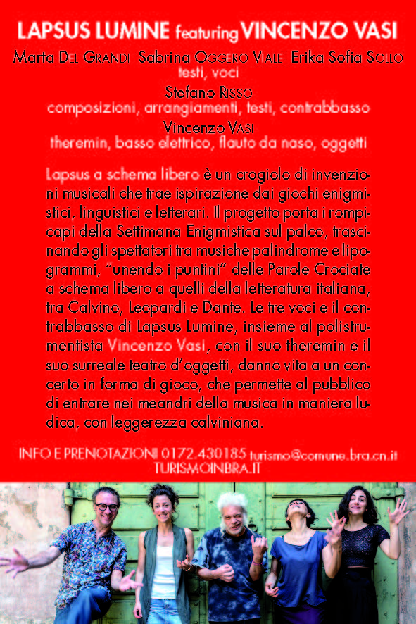 Un inedito concerto “a schema libero”, nato dall’incontro tra il trio vocale torinese Lapsus Lumine e l’estro di Vincenzo Vasi, suonatore di theremin e oggetti, è l’evento finale della rassegna jazz estiva ospitata nel cortile di Palazzo Traversa a Bra. L’appuntamento è mercoledì 25 agosto 2021 alle 21, negli spazi esterni del Museo di Arte, Storia e Archeologia, in uno spettacolo ad ingresso gratuito organizzato dal Comune di Bra in collaborazione con il Festival CHAMOISic.