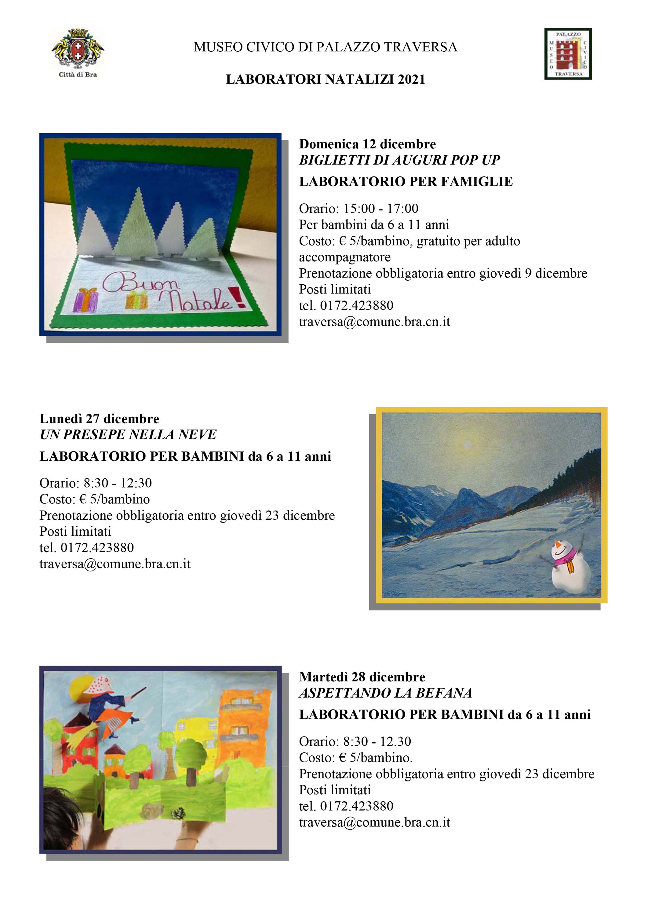Il programma prevede ancora due appuntamenti a Palazzo Traversa il 27 e il 28 dicembre: il primo sarà dedicato al Presepe, mentre il secondo alla Befana. Entrambi si svolgono dalle 8.30 alle 12,30, costo 5 euro, prenotazione obbligatoria entro il 23 dicembre allo 0172-423880 (non è prevista la presenza di un adulto accompagnatore). I primi giorni del 2022 offriranno ancora due occasioni imperdibili: martedì 4 gennaio dalle 16,45 alle 18,30 si inizierà il nuovo anno con il riciclo, laboratorio creativo che prevede l’utilizzo di materiale di recupero (costo 3 euro, prenotazione obbligatoria allo 0172-412010, mail craveri@comune.bra.cn.it), mentre il 6 gennaio la Befana in persona sarà la guida turistica che accompagnerà i giovani visitatori in un tour del Museo del Giocattolo. Al termine della visita bambini e adulti saranno guidati nella costruzione di un giocattolo con materiali naturali e di recupero (costo 5 euro, prenotazione obbligatoria allo 0172.413049, mail biblioteca@comune.bra.cn.it.