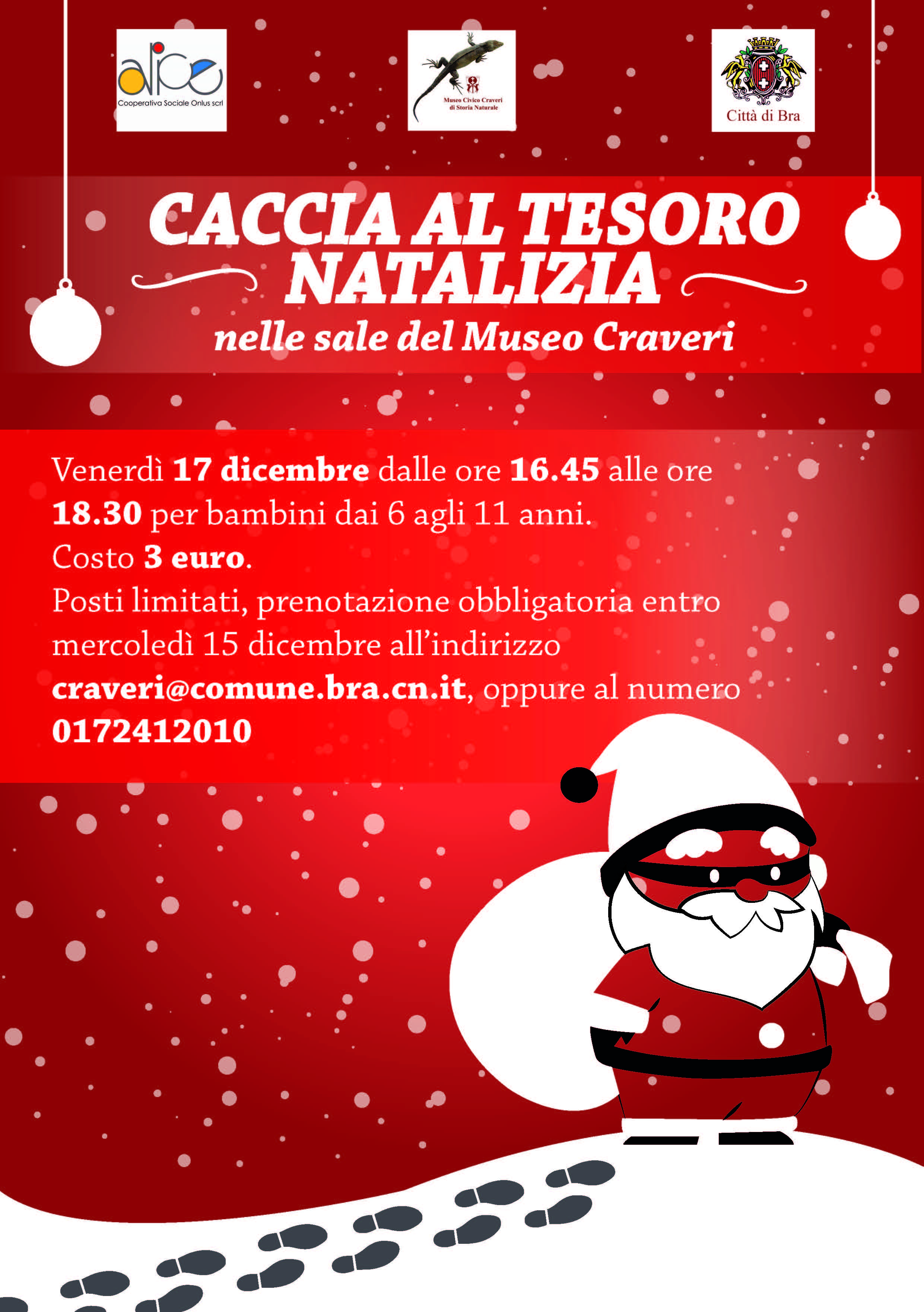 Il 17 dicembre toccherà al Museo Craveri organizzare una “Caccia al tesoro natalizia”: si tratta di un laboratorio che insegnerà a realizzare addobbi natalizi con materiale di recupero (orario: 16,45/18,30, costo 3 euro a bambino. Prenotazione obbligatoria allo 0172-412010 oppure scrivendo a craveri@comune.bra.cn.it).