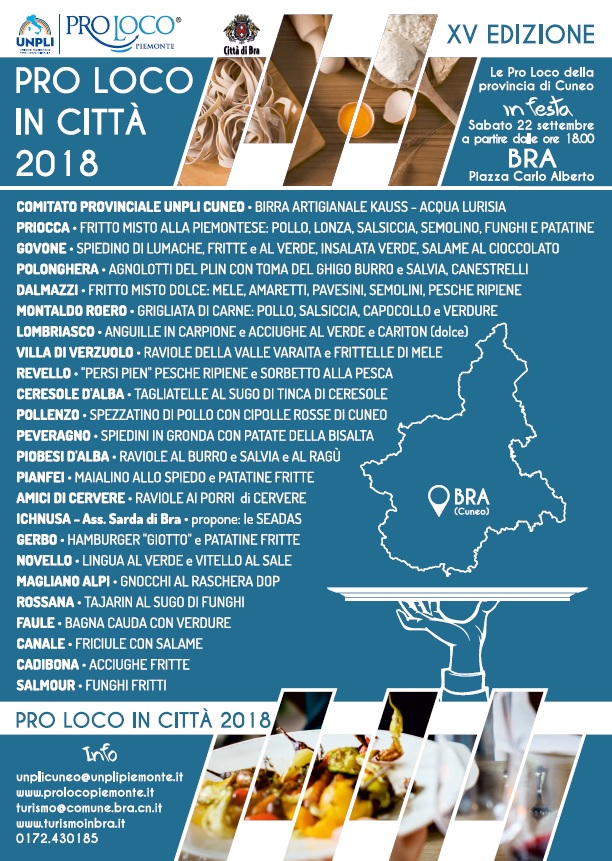 Le Pro loco cuneesi si danno appuntamento a Bra, sabato 22 settembre 2018, per una festa di piazza i cui rodati ingredienti sono le specialità del territorio – in un ricco menù da comporre a piacimento, assaggiando i golosi piatti preparati sul momento dagli stand con cucina attrezzata -, la musica e il folklore tradizionale.