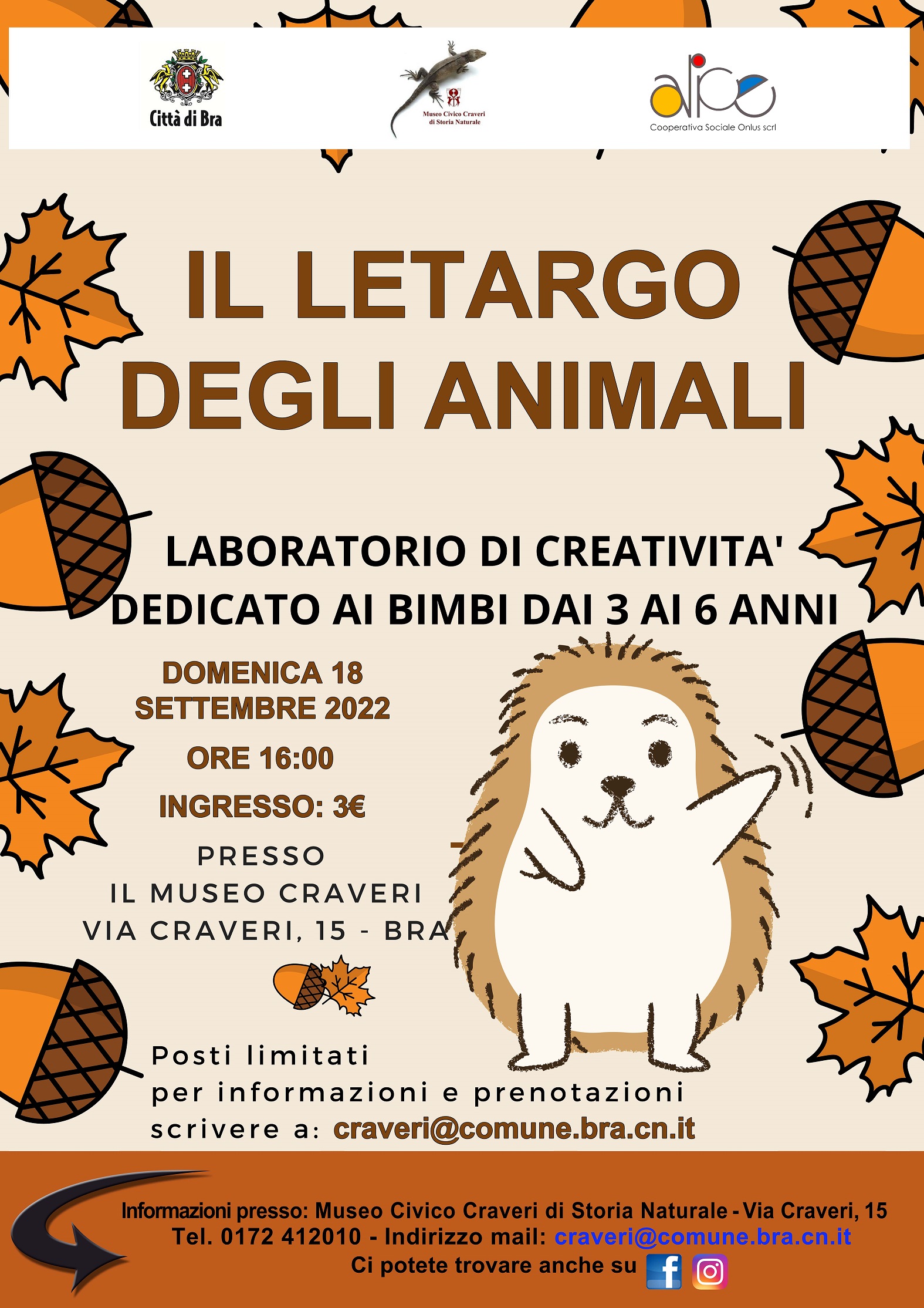 Nell’ambito dell’iniziativa delle “Settimane della scienza”, domenica 18 settembre 2022, a partire dalle 16, il Museo civico Craveri di storia naturale organizza un laboratorio di creatività dal titolo “Il letargo degli animali”. Immersi nelle meravigliose sale del Museo Craveri i bambini, dai 3 ai 6 anni, verranno coinvolti nella lettura di una fiaba che avrà come protagonisti gli animali esposti in museo. Seguirà un laboratorio manuale durante il quale i bambini realizzeranno un lavoretto a tema.