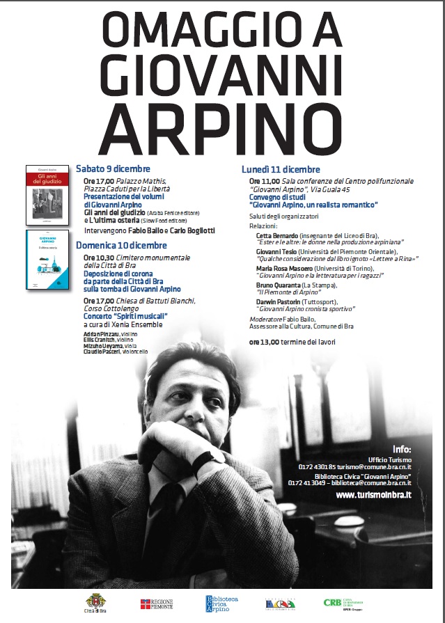 Lunedì 11 dicembre, invece, alle 11, nella sala conferenze del Centro polifunzionale “Giovanni Arpino”, Via Guala 45 si terrà il Convegno di studi “Giovanni Arpino, un realista romantico” a cui prenderanno parte Cetta Bernardo (ex insegnante del Liceo di Bra) che parlerà di “Ester e le altre: le donne nella produzione arpiniana”; Giovanni Tesio (docente dell’Università del Piemonte Orientale) con la relazione ”Qualche considerazione dal libro ignoto «Lettere a Rina»”; Maria Rosa Masoero (Università di Torino) che parlerà di “Giovanni Arpino e la letteratura per i ragazzi” e i giornalisti Bruno Quaranta (La Stampa) con un intervento su “Il Piemonte di Arpino” e Darwin Pastorin (Tuttosport) per tracciare un ritratto di “Giovanni Arpino cronista sportivo”.