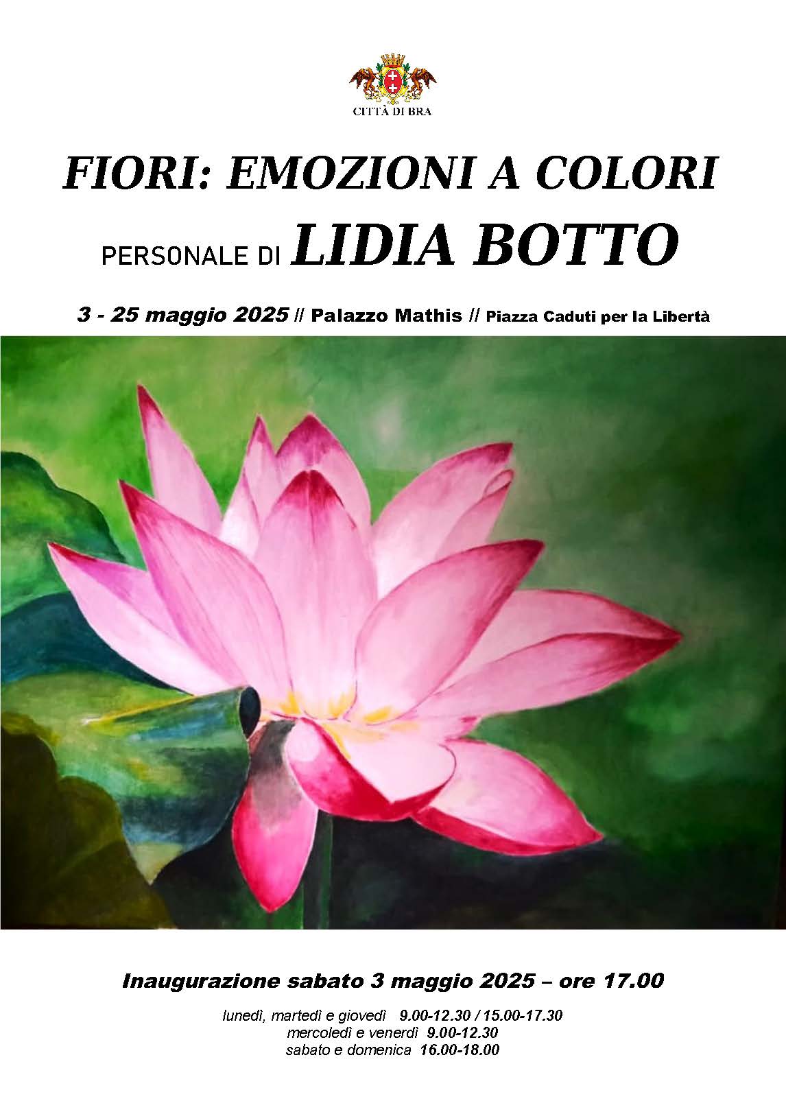 Palazzo Mathis ospita dal 3 al 25 maggio 2025 a la personale della pittrice Lidia Botto dal titolo “Fiori: emozioni a colori”. Nello storico edificio di piazza Caduti per la Libertà verranno esposte ventisei opere dell’artista braidese, tutte dedicate al mondo dei fiori, indagato in tutto il suo splendore, interpretato con una personale visione delle forme, dal taglio spesso insolito e dai colori talvolta vivaci e splendenti, talvolta tenui e delicati. Un mondo la cui cifra è la ‘bellezza’ che si realizza in infinite sfumature di colore e rivela forme originali, di grande suggestione. Il tema dei fiori è sempre stato presente nel mondo artistico della pittrice che, pur dedicandosi anche ad altri temi, lo ha sempre coltivato assiduamente.