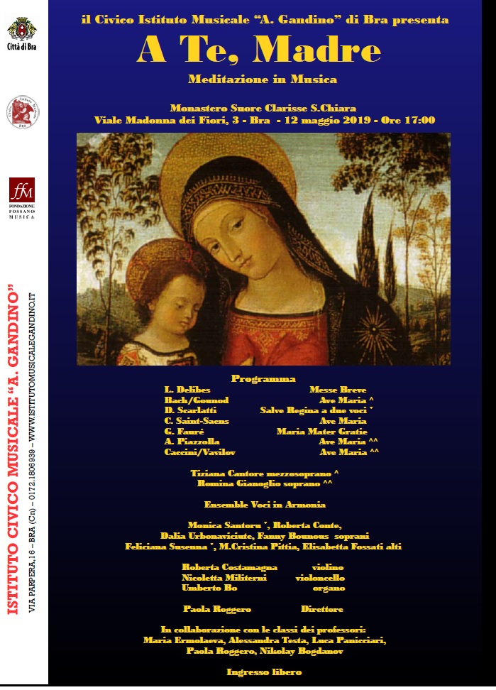 Apre la rassegna dei concerti “A te, Madre”, meditazione in musica in programma domenica 12 maggio 2019 alle 17 nella Chiesa del Monastero delle Suore Clarisse (viale Madonna Fiori, 3),  con un programma sacro dedicato alla Madonna, proprio nel giorno della Festa della Mamma. Brani di Bach e Gounod, Saint-Saens, Fauré, Piazzolla e Scarlatti saranno eseguiti dalla mezzosoprano Tiziana Cantore e dalla soprano Romina Gianoglio, accompagnate dall’Ensemble Voci in Armonia e da Roberta Costamagna al violino, Nicoletta Militerni al violoncello e Umberto Bo all’organo. Dirige Paola Roggero. Ingresso libero.