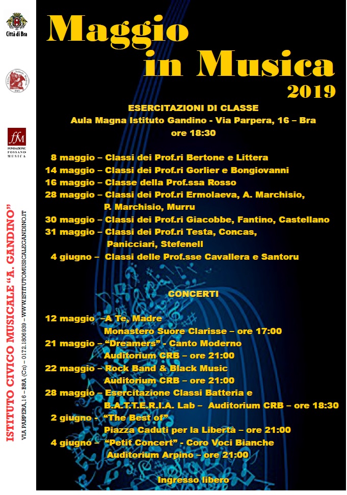 Il calendario degli eventi del “Maggio in Musica 2019” è pubblicato sul sito del Civico Istituto Musicale “A.Gandino” di Bra www.istitutomusicalegandino.it. Tutti gli appuntamenti sono ad ingresso libero. Maggiori informazioni contattando l’Istituto civico musicale “Adolfo Gandino” al numero 0172.1806939 o via mail, all’indirizzo istitutocivicomusicale@gmail.com.