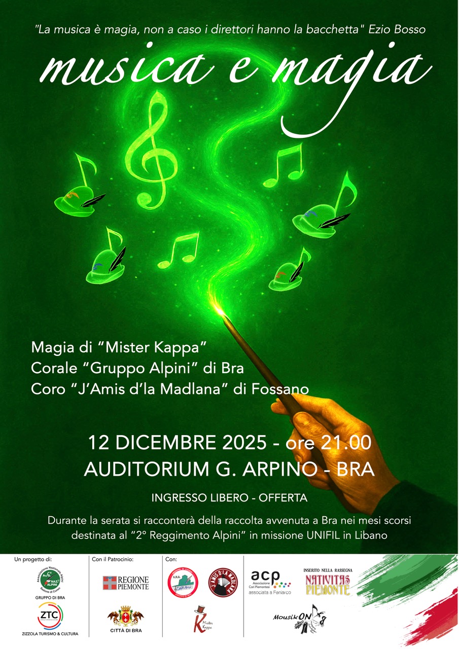 Venerdì 12 dicembre 2025 alle ore 21, presso l’Auditorium Arpino di Bra, si svolgerà uno spettacolo dal titolo “Musica e Magia”. Come da tradizione, nel mese di dicembre il gruppo Alpini di Bra organizza una serata conviviale per augurare Buone Feste.