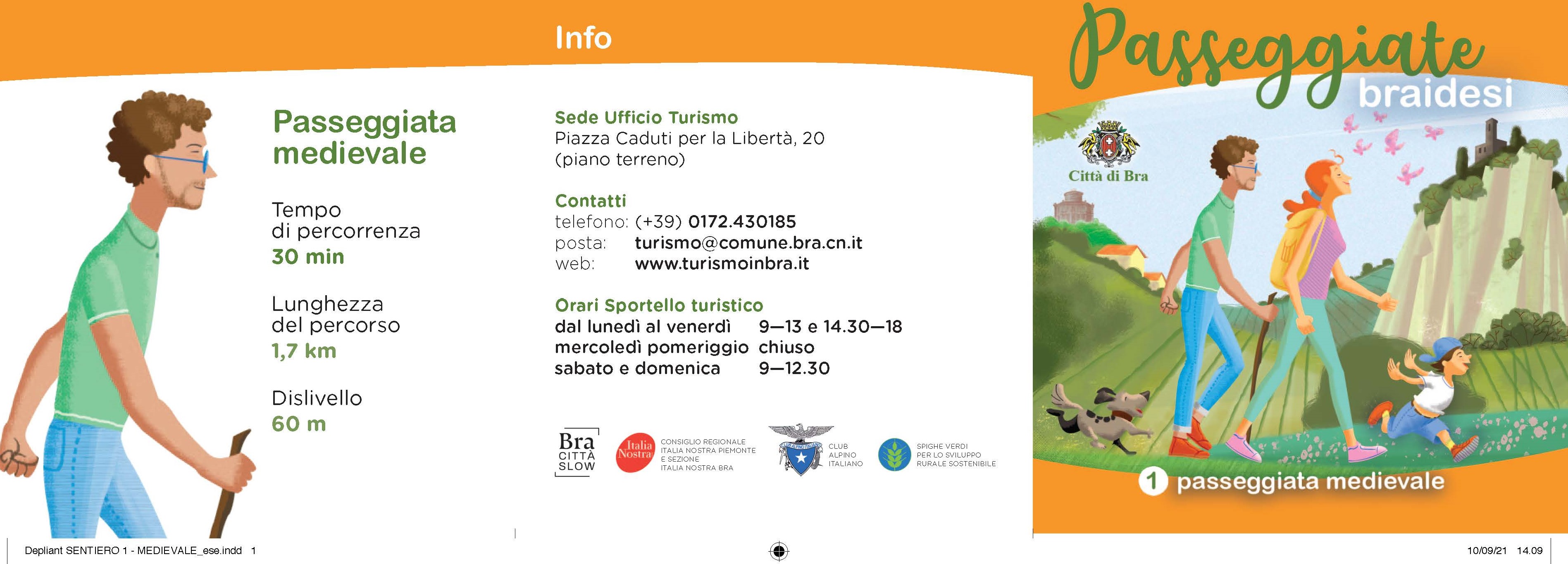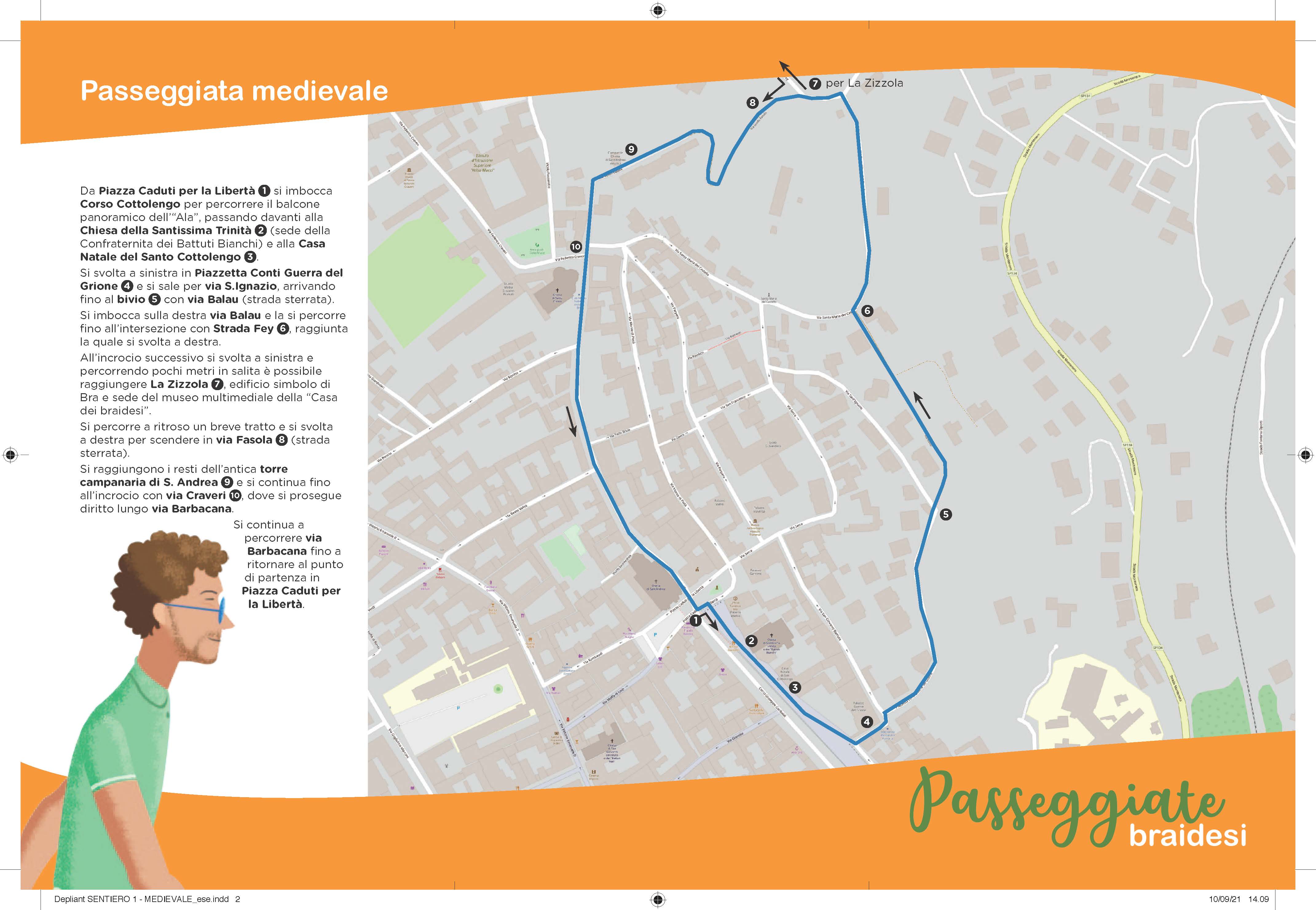 E’ possibile ammirare le bellezze della città di Bra e del territorio circostante percorrendo cinque itinerari con percorsi dalla lunghezza crescente. Il primo sentiero è quello dedicato alla “Città medioevale”: 1,7 km di percorso (percorribili in 30 minuti con andatura tranquilla) che tocca punti di grande interesse come l’Ala di corso Garibaldi, piazza Caduti per la Libertà, fino ad arrivare alla Zizzola. Si passa poi alla “Passeggiata del Belvedere”, con partenza dal Santuario della Madonna dei Fiori e tappe a San Matteo e San Michele (6 km, 1 ora e 30 minuti). Come facilmente intuibile, il “Sentiero degli orti” permetterà di andare alla scoperta delle serre che ospitano le produzioni agricole locali: partenza dai giardini del Belvedere della Rocca, quindi si percorrono le strade vicinali degli Orti e della Banchetta per poi dirigersi in strada Gerbido (4,6 km, 1 ora). Si allontana di più dalla città la “Passeggiata in Fey”, un percorso di 6,4 km che da via Serra si snoda lungo strada Fey, strada Montenero, strada Moreis e strada Marie, per poi ritornare in città attraverso strada San Michele e via Craveri (1 ora e 30 minuti). Il più lungo degli itinerari è infine quello della “Passeggiata del Bandito” (11,5 km, 3 ore), che dal centro dell’omonima frazione si dirige verso strada Terrapini e strada Cavallasso, per poi percorrere un tratto del sentiero S1 all’interno della Zona di salvaguardia dei boschi e delle Rocche del Roero. Dopo aver attraversato il Rio Ripoglia (o Rio di Sanfrè), si imbocca via della Cicala per ricongiungersi a strada Terrapini.