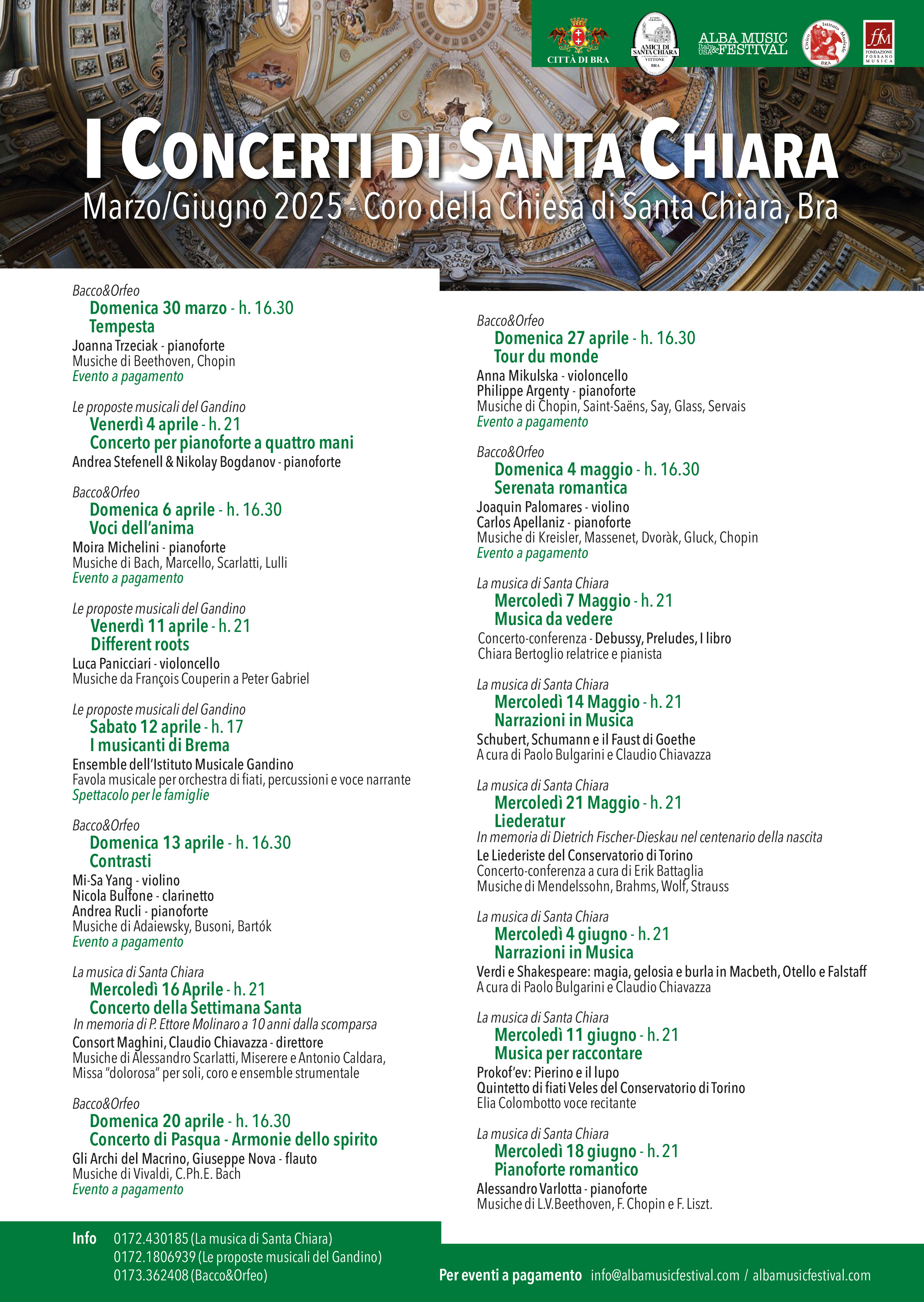 “Grazie al contributo di diversi gruppi e associazioni musicali già noti e apprezzati in città per le proposte artistiche delle passate stagioni”, commentano il sindaco Gianni Fogliato e il suo vice con delega alla cultura Biagio Conterno, “è stato possibile realizzare una variegata rassegna che si rivolge non solo a un pubblico già esperto, ma anche ai giovani che vogliano avvicinarsi ai linguaggi della musica classica. Siamo certi che tale approccio sia anche un omaggio alla memoria di padre Ettore Molinaro, nel decimo anniversario della morte, che per lunghi anni ha animato le iniziative culturali di Santa Chiara”.