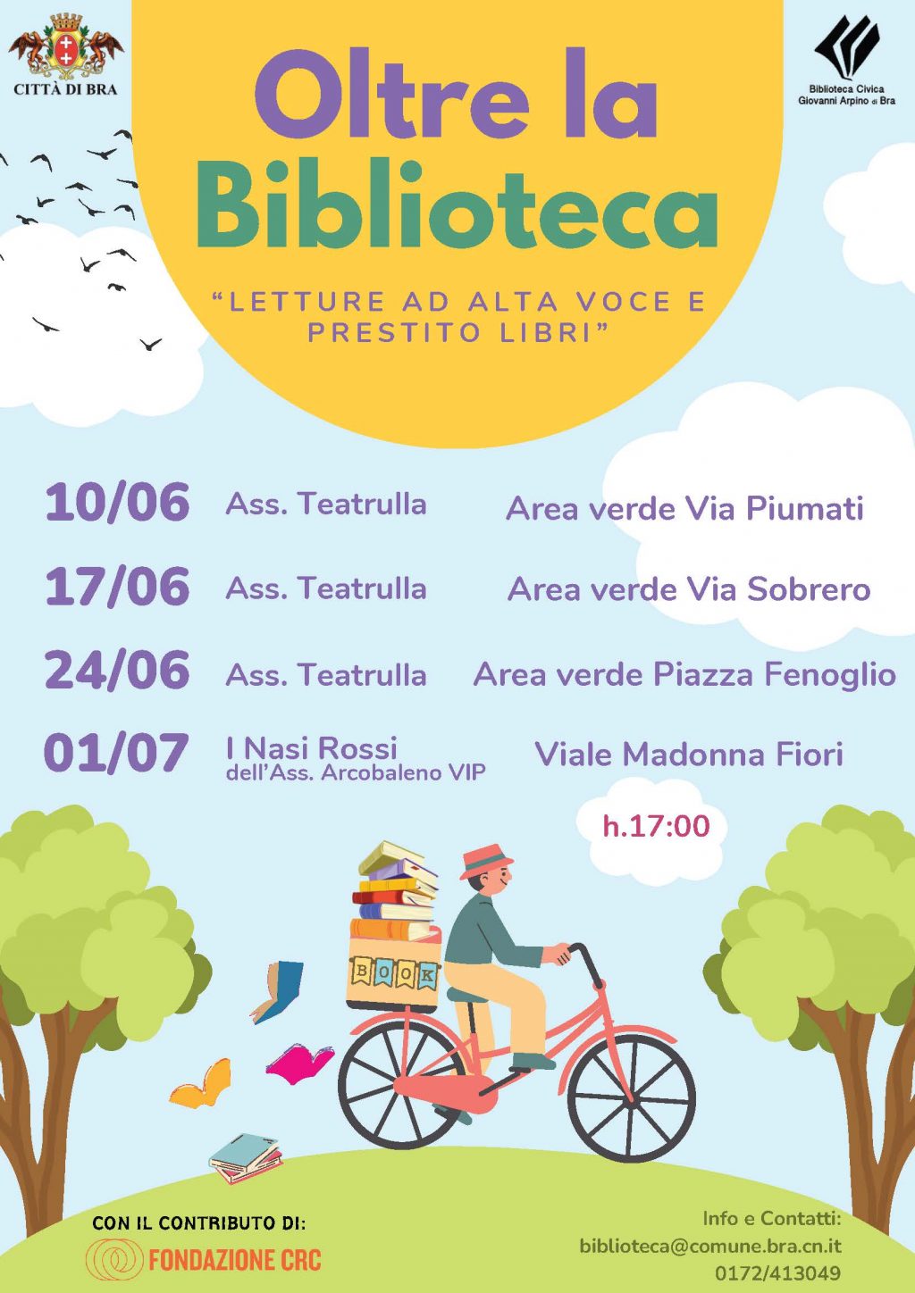 Finisce la scuola, torna la bella stagione e, con lei, arriva nuovamente a Bra “Oltre la Biblioteca”, iniziativa dedicata ai bimbi/e dai tre anni in su (e alle loro famiglie), che porta le letture ad alta voce e il prestito dei libri nelle aree verdi della città.