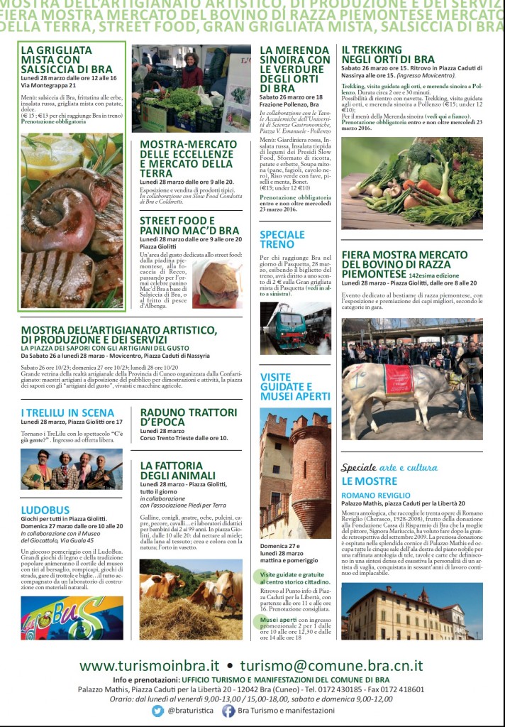 Per informazioni e prenotazioni contattare l’Ufficio Turismo e Manifestazioni del Comune di Bra allo 0172.430185, via e-mail all’indirizzo turismo@comune.bra.cn.it , sul sito web www.turismoinbra.it e sui principali social network, cercando “Comune Bra”. Il Passaggio a Bra in tempo di Primavera è organizzato dal Comune di Bra in collaborazione con la Regione Piemonte, la Provincia di Cuneo, Coldiretti, Confartigianato, Camera di Commercio, Ente Turismo Alba Bra Langhe e Roero, Ascom Bra, la CRBra e la Fondazione CRBra, il Consorzio di tutela della Salsiccia di Bra, i Musei di Bra e la Pro Loco La Torre di Pollenzo.