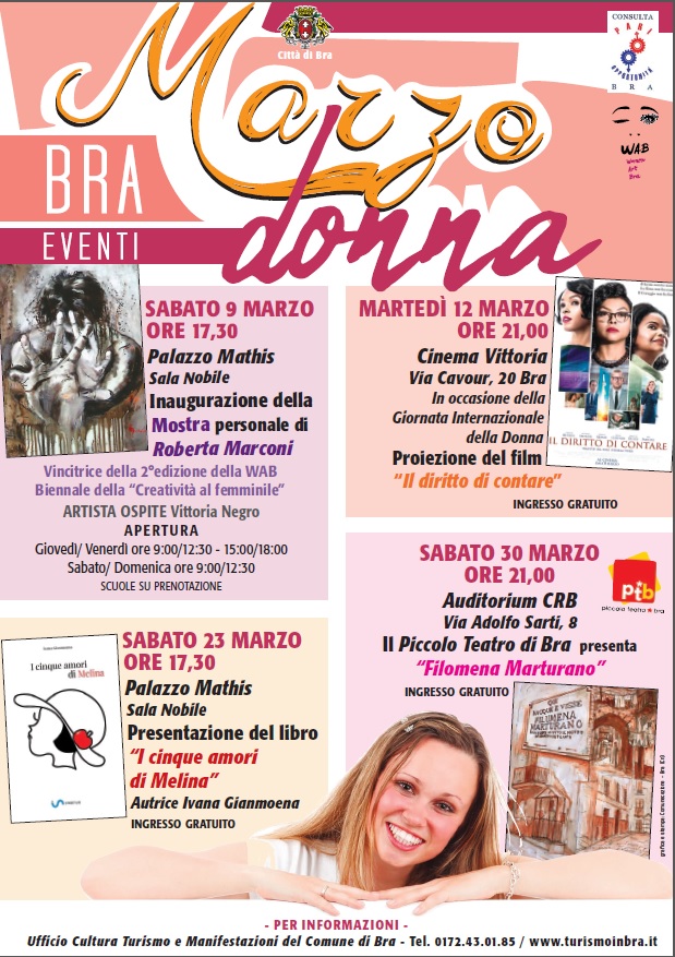 Il calendario di “Marzo donna” prosegue martedì 12 marzo al Cinema Vittoria di via Cavour, alle 21, con la proiezione ad ingresso libero de “Il diritto di contare”: il film è ispirato alla storia vera di di tre ricercatrici afroamericane della Nasa e del loro contributo, pur tra discriminazioni sessiste e razziali, alle prime missioni spaziali americane. Sabato 23 marzo, alle 17,30, a Palazzo Mathis sarà presentato il libro “I cinque amori di Melina” della braidese Ivana Gianmoena. Appuntamento con il teatro, invece, sabato 30 marzo alle 21 all’auditorium della Cassa di Risparmio di Bra in via Sarti. La compagnia Piccolo Teatro di Bra porta in scena l’intramontabile pièce di Eduardo De FIlippo “Filomena Marturano”. Lo spettacolo è ad ingresso gratuito. Per info: Ufficio Cultura, turismo e manifestazioni del Comune di Bra tel 0172 430185 – turismo@comune.bra.cn.it. (ea)