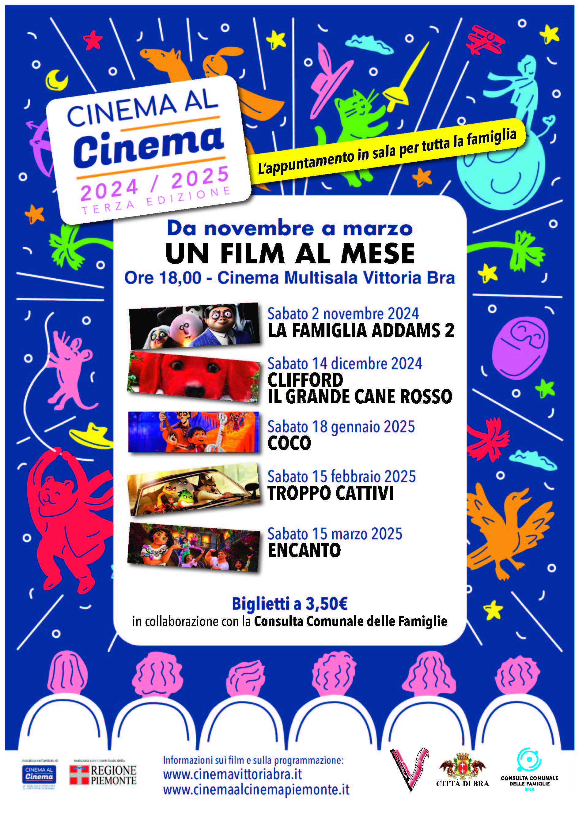 In calendario sono previsti cinque appuntamenti presso il Cinema Multisala Vittoria di via Cavour 20: sabato 2 novembre 2024 si proietta “La Famiglia Addams 2”, il 14 dicembre sarà la volta di “Clifford, il grande cane rosso”, sabato 18 gennaio 2025 protagonista del grande schermo sarà “Coco”, mentre il 15 febbraio tocca a “Troppo cattivi”, per concludere il 15 marzo con “Encanto”.