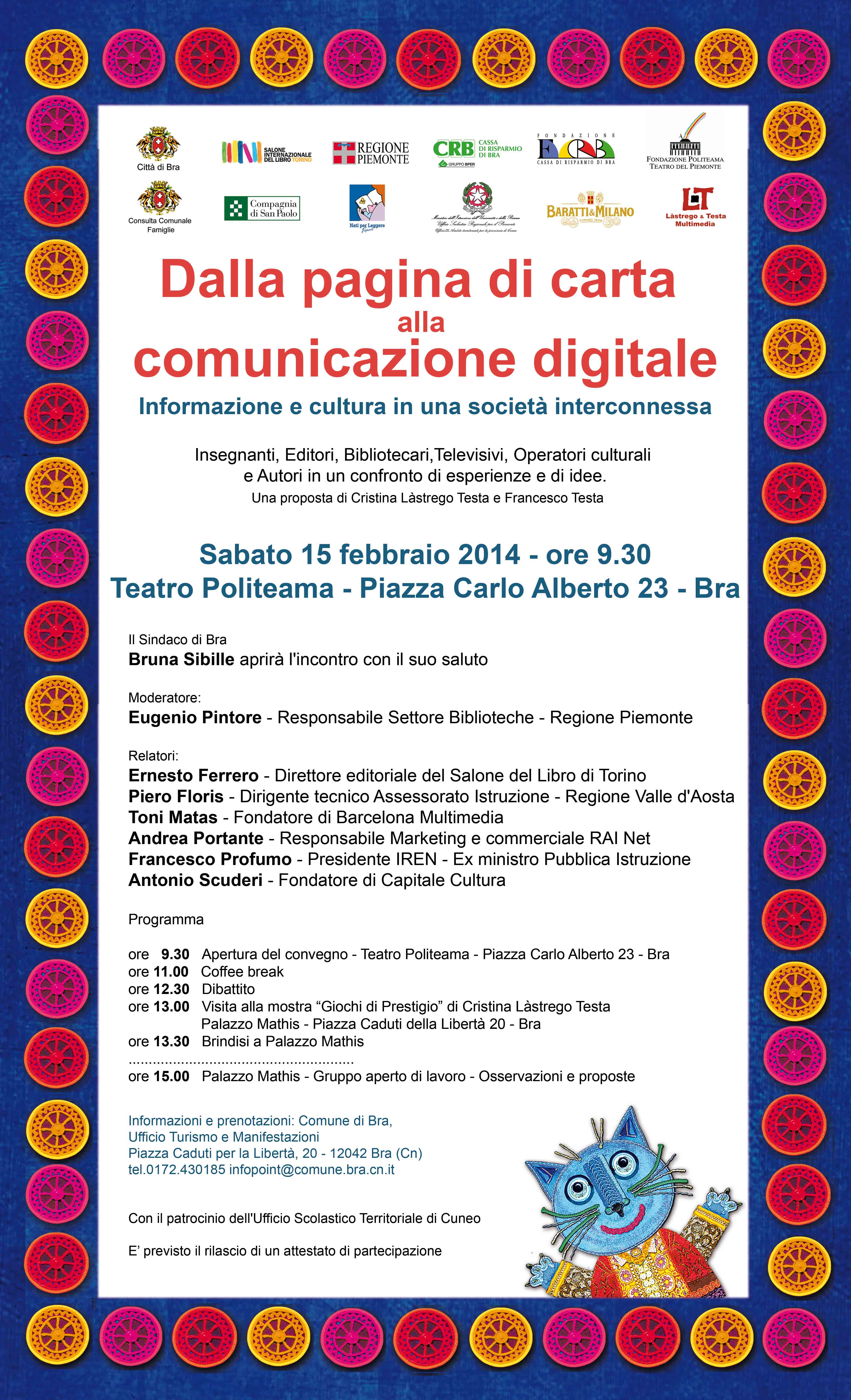 “Dalla pagina di carta alla comunicazione digitale” è il titolo del convegno organizzato dal comune di Bra con il patrocinio del Ministero dell’Istruzione, dell’Università e della Ricerca, su proposta della coppia Cristina Làstrego e Francesco Testa, autori di libri, disegni animati e, recentemente, di applicazioni digitali per bambini.