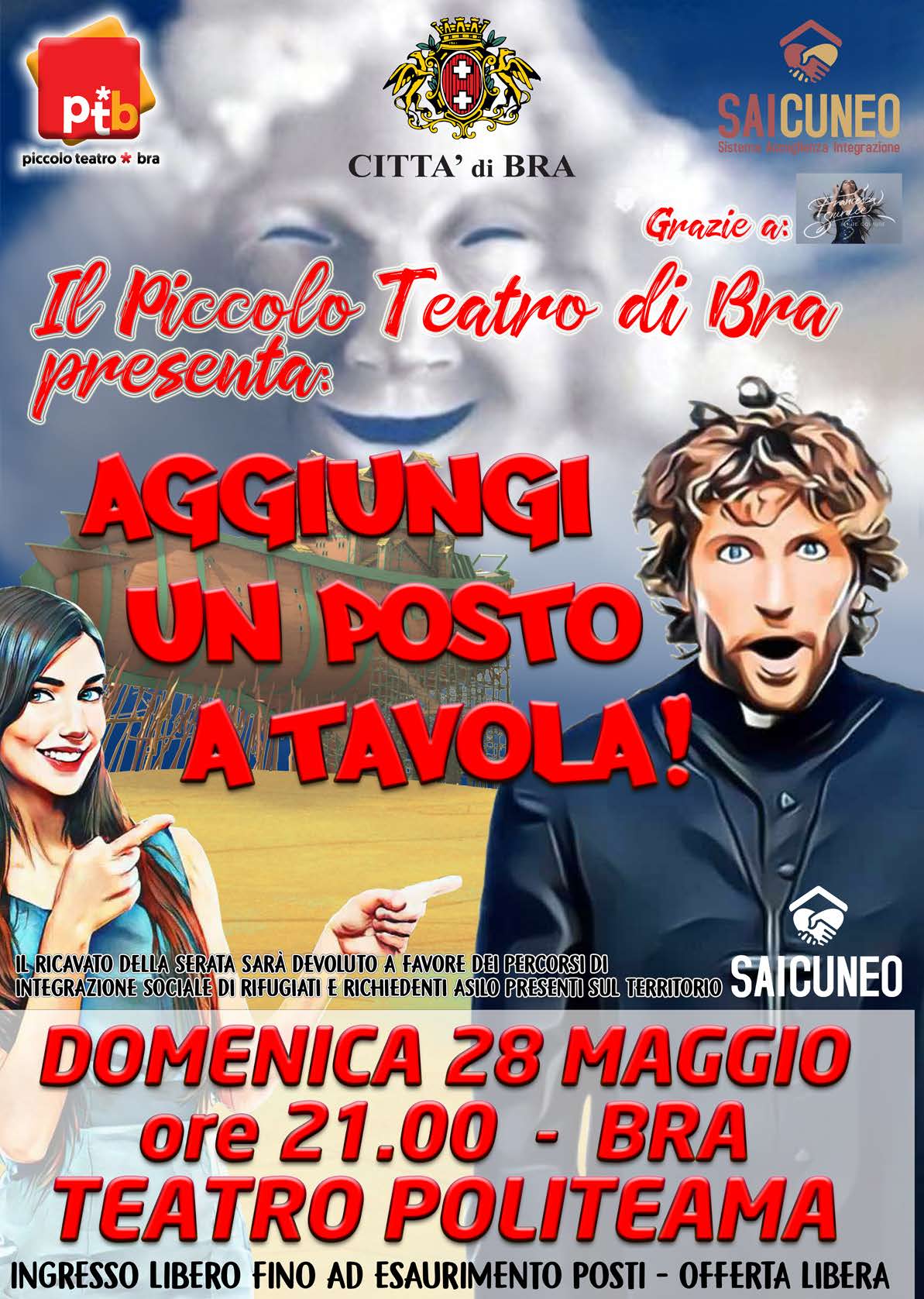 La data è il 28 maggio, la location quella dello stupendo Teatro Politeama di Bra, l’occasione è quella della data di debutto del nuovo musical prodotto dall’associazione di volontariato Piccolo Teatro di Bra, attiva sul territorio braidese da oltre 15 anni; la motivazione in più quella di sostenere la rete degli enti locali che promuovono e realizzano progetti di accoglienza a favore di persone titolari di protezione internazionale: il Sistema di Accoglienza e Integrazione (SAI).