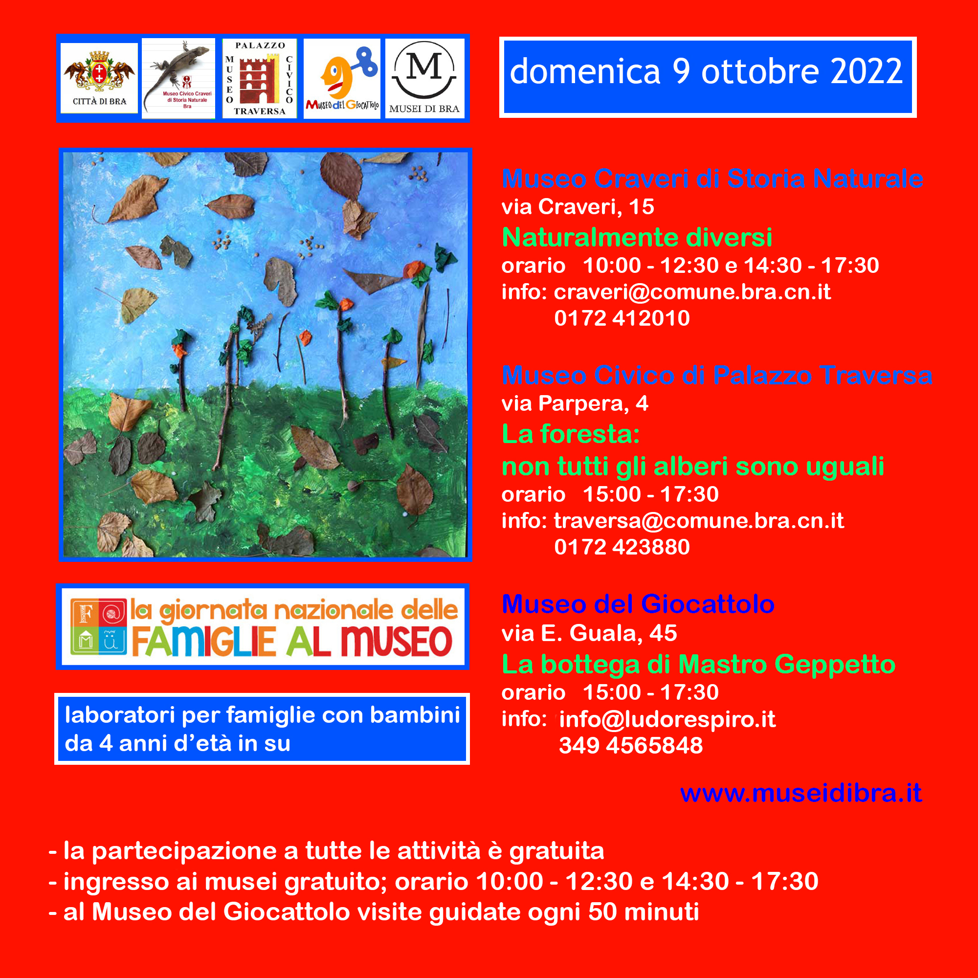 Anche quest’anno i musei di Bra aderiscono alla Giornata nazionale delle Famiglie al museo. La data da segnare sul calendario è quella di domenica 9 ottobre 2022. Il tema conduttore di questa edizione dell’iniziativa, “Diversi e uguali” , è trattato attraverso la metafora dell’albero, sia esso rappresentato come nell’arte o nel gioco, oppure nel suo ambiente naturale. I temi dell’identità e della diversità, elementi essenziali per crescere in una società inclusiva, sono oggetto di una serie di divertenti laboratori per famiglie con bambini dai 4 anni in su.