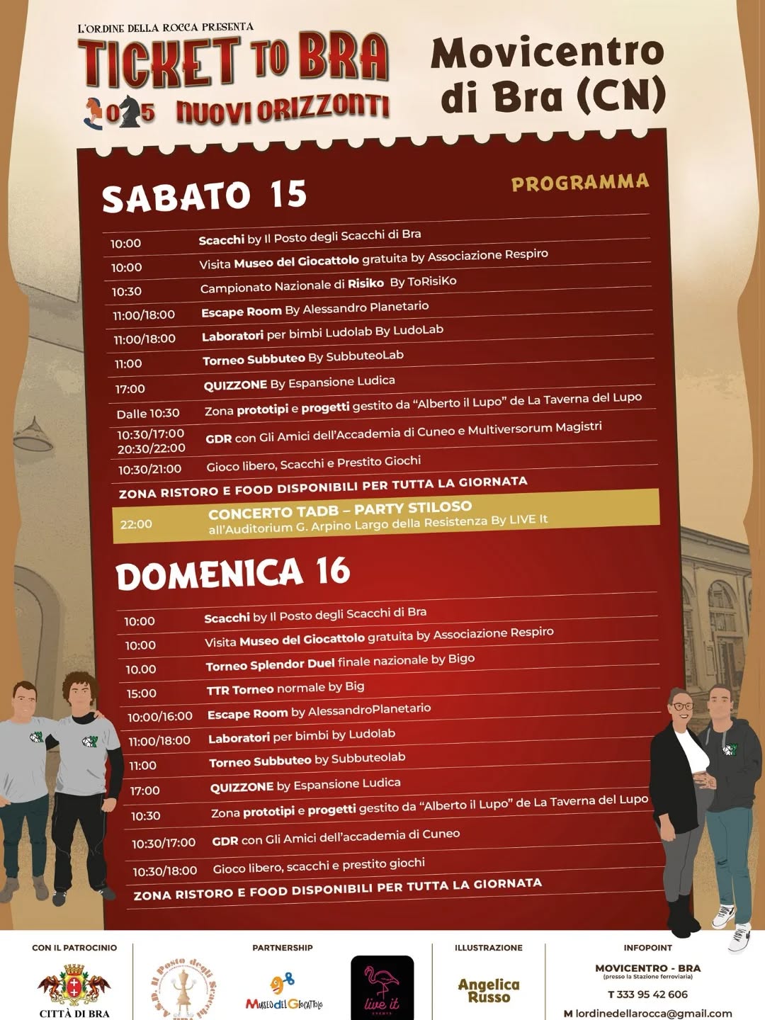 Ormai ci siamo! Dopo lo straordinario successo fatto registrare nella Prima Edizione, è alle porte l’attesissimoTicket to Bra! IlTicket to Brasi delinea come l’evento ludico dell’annonella città di Bra, nonché manifestazione di punta per l’intera regione Piemonte: un’occasione da non perdere per tutti gli appassionati di giochi da tavolo, ma anche per coloro che si affacciano per la prima volta a questo “mondo” e, perché no, anche per i semplici curiosi. Protagonistaèl’associazione braidese Ordine della Rocca,l’organizzatoredell’evento, con la collaborazione nata quest’anno dell’associazione Il Posto Degli Scacchi Bra e l’associazione Respiro (Museo del Giocattolo). Ma di cosa si tratta? L’evento, fissato per sabato15novembre(dalle09:30alle 22:00) e domenica16novembre(dalle09:30alle 19) presso il suggestivo Movicentro di Bra (in via Trento e Trieste 6, accanto alla stazione), consiste in due intere giornate di gioco, durante la quale sarà possibile cimentarsi in sfide emozionanti, testando le proprie doti strategiche e di pianificazione. L’obiettivo? Diffondere la passione per il gioco da tavolo moderno come momento di aggregazione tra i giovani (e non), amici e famiglie. Durante l’evento sarà possibile conoscere e provare i più famosi giochi presenti in circolazione grazie all’imponente ludoteca che verrà allestita per l’occasione. Gioco libero, con gli oltre 300 giochi da tavolo messi a disposizione dall’associazione, ma non solo. Quizzone, Area ristoro, Giochi di ruolo, Autori e vendita al pubblico. Inoltre quest’anno Scacchi, Subbuteo, Escape Room itinerante e visita gratuita al Museo del Giocattolo. Niente paura per la scelta e per la lettura dei regolamenti, ci saranno volontari e “spiegagiochi” a guidarvi in ogni passo. L’associazione svolge già settimanalmente l’opera di divulgazione del gioco in scatola e di ruolo attraverso serate dedicate. In particolare, l’associazione cittadina Ordine della Rocca apre le portedell’associazione in Via Regina Margherita 28, Pollenzo a Braogni giovedì a partire dalle 20.00. L’evento è resopossibile, inoltre,grazie al prezioso supporto del comune di Bra. Siete curiosi? Cerchiate le date sul calendario e accorrete numerosi. È possibile seguire i preparativi e scoprire maggiori dettagli relativamente all’evento seguendo la pagina Facebook “Ordine della Rocca”, Vi aspettiamo!