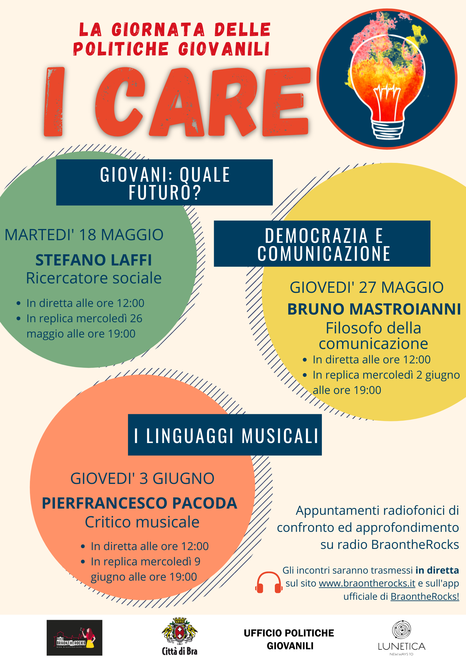 L’edizione 2021 di “I Care” verterà su tre tematiche: “Giovani: quale futuro?”, “Democrazia e comunicazione” e “Linguaggi musicali”. Gli incontri andranno in onda alle ore 12 di martedì 18 maggio, giovedì 27 maggio e giovedì 3 giugno sulla web radio Braontherocks (www.braontherocks.it e sull’app “Braontherocks”), e saranno riproposti in replica per tre mercoledì (26 maggio, 2 giugno, 9 giugno) alle ore 19.