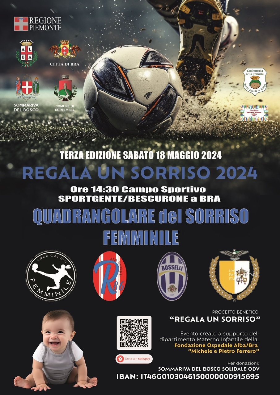 SABATO 18 MAGGIO 2024, a BRA/Campi Sportivo Sportgente/Bescurone, a partire dalle ore 14.30, QUADRANGOLARE FEMMINILE DEL SORRISO (con la partecipazione della Nazionale Vaticana, Rosselli, Racco 86 ed Area Calcio Alba).