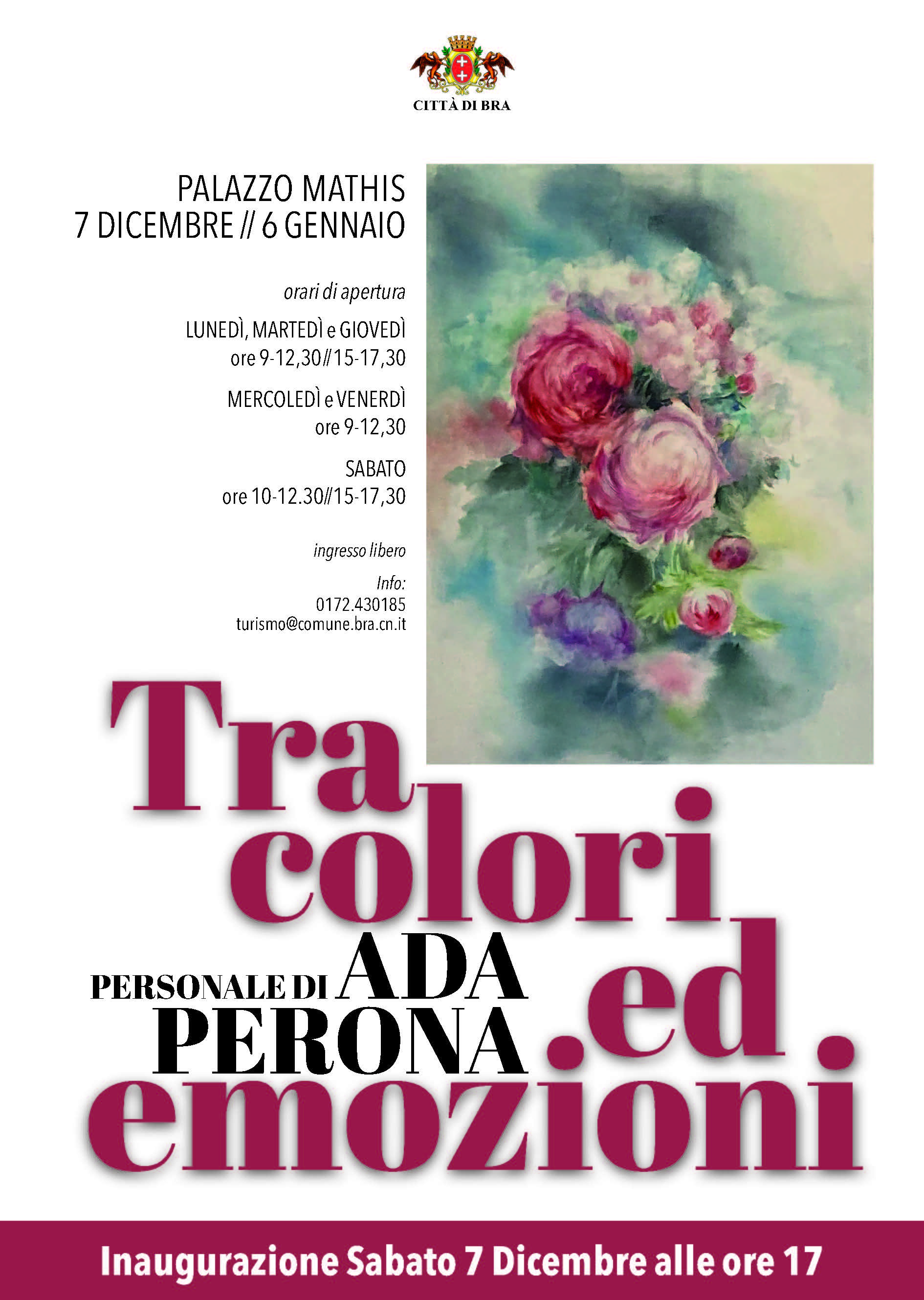 L’esposizione “Tra colori ed emozioni” (7 dicembre – 6 gennaio) sarà visitabile il lunedì, martedì e giovedì in orario 9-12,30//15-17,30, il mercoledì e venerdì dalle 9 alle 12,30, il sabato in orario 10-12.30//15-17,30. Ingresso libero. Info: 0172.430185 – turismo@comune.bra.cn.it.