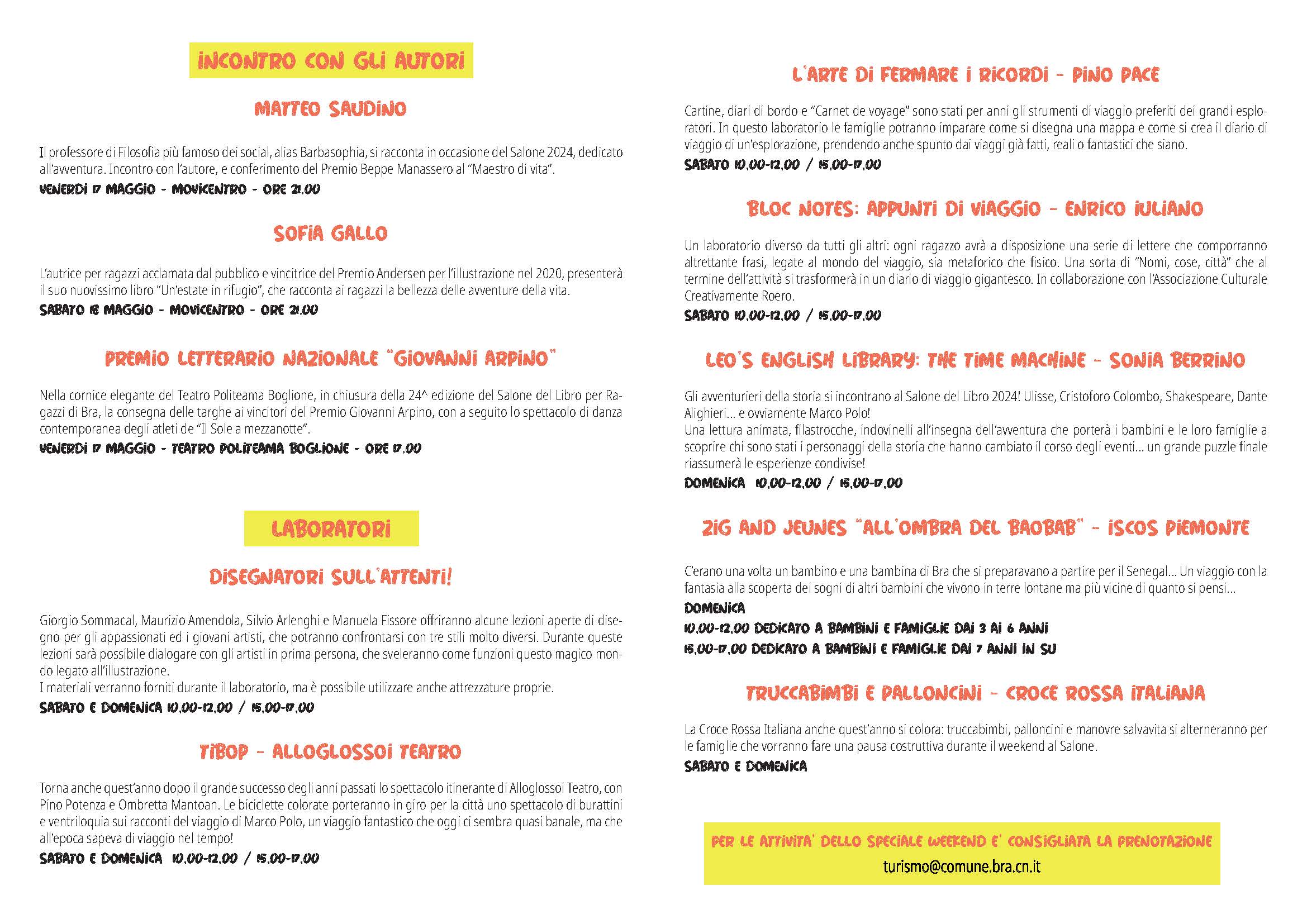 L’inaugurazione della manifestazione è in programma per venerdì 15 maggio alle 10,30. Nell’occasione verrà annunciato il vincitore del premio “Beppe Manassero”, riconoscimento istituito per ricordare l’ex maestro e direttore dell’Ufficio turismo cittadino che ogni anno viene consegnato ad una persona che si è distinta sotto il profilo pedagogico. Nel 2024 il premio viene assegnato al prof. Matteo Saudino, alias BarbaSophia. La cerimonia di consegna si terrà venerdì 17 maggio alle 21, sempre al Movicentro.