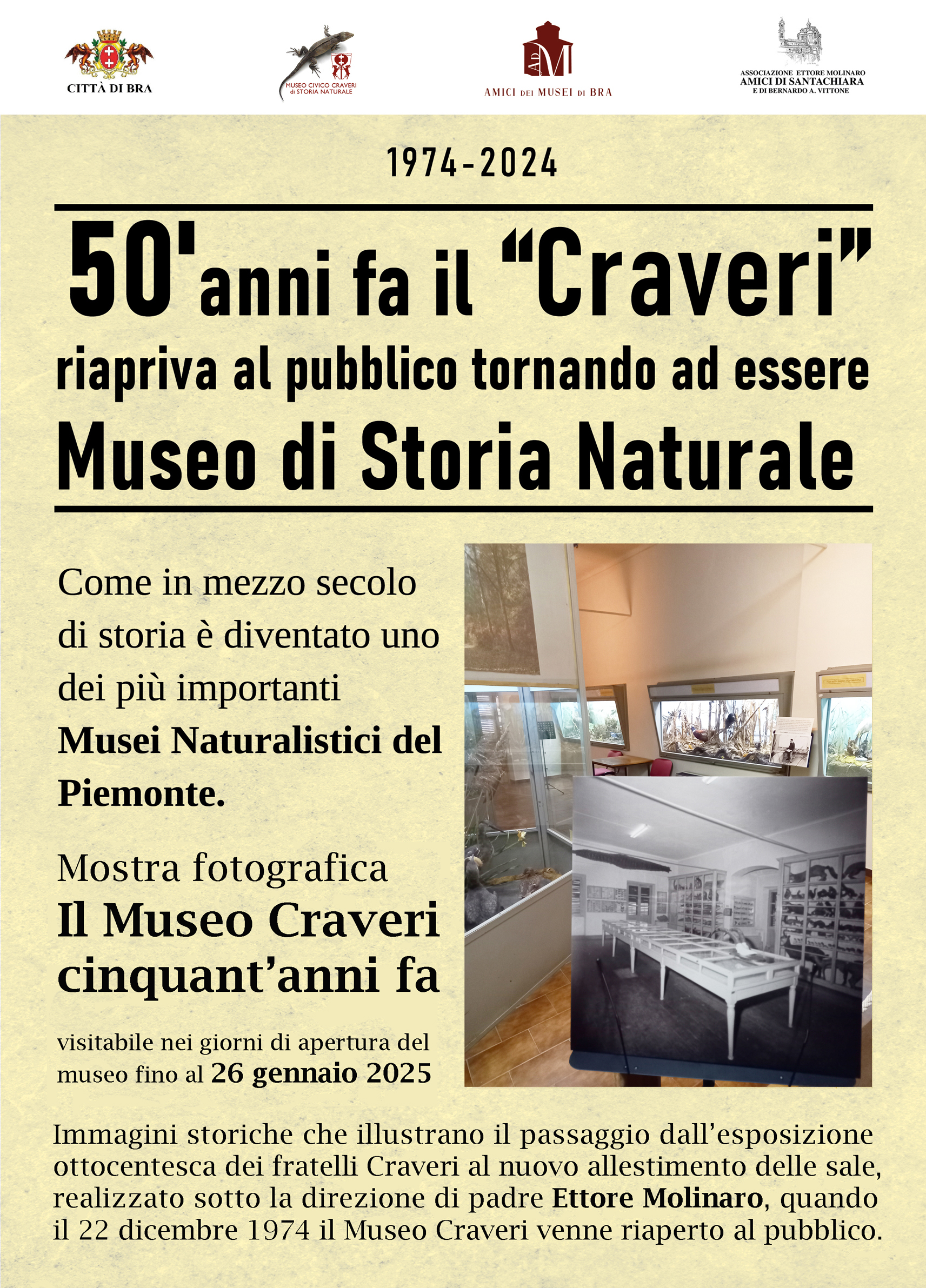 In occasione delle celebrazioni, nelle sale della struttura – oggi diventata uno dei più importanti Musei Naturalistici del Piemonte – è stata allestita la mostra fotografica “Il Museo Craveri 50 anni fa”, con scatti in bianco e nero delle sale inaugurate nel 1974 ad opera di Ettore Molinaro. In mostra immagini storiche che illustrano il passaggio dall’esposizione Ottocentesca al nuovo allestimento, in occasione della riapertura al pubblico di mezzo secolo fa. La mostra sarà visitabile fino al 26 gennaio 2025, la domenica dalle 10 alle 12:30 e dalle 14:30 alle 17:30, il giovedì dalle 15 alle 18 e, solo su prenotazione, il martedì, mercoledi, giovedi e venerdì dalle 8:30 alle 12:30.