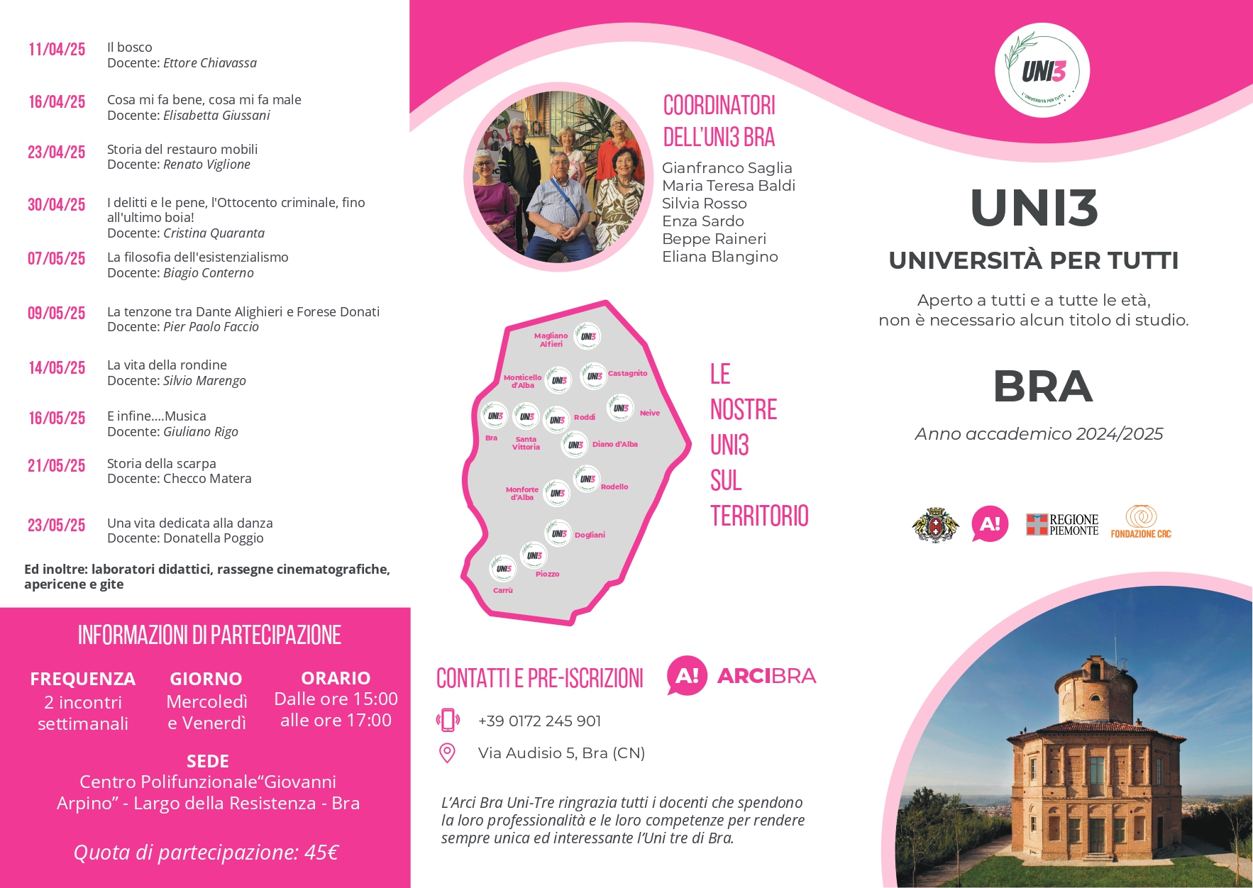 Per informazioni ed iscrizioni: Arci Bra Uni.tre, Via Audisio, 5 – Bra – Tel. 0172/245901 www.arcibra.it
