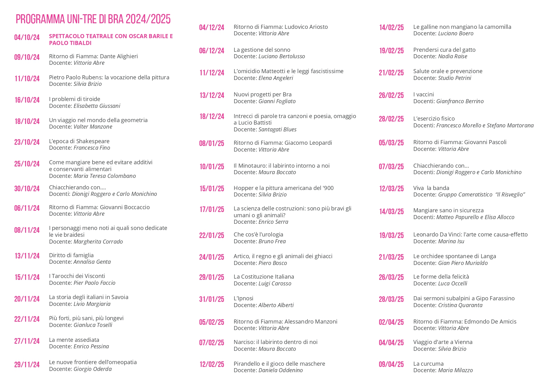 Il nuovo anno accademico dell’Uni3 di Bra propone un programma ricchissimo e variegato per soddisfare gusti ed esigenze di tutti coloro che vogliono coltivare la propria cultura. Sono previsti due incontri settimanali di due ore ciascuno (dalle 15.00 alle 17.00) il mercoledì e il venerdì in cui vengono trattati temi di attualità e di cultura generale. Nel corso dell’anno è inoltre possibile frequentare numerosi laboratori pomeridiani, gite e eventi culturali nei seguenti giorni: lunedì, martedì e giovedì. Il programma può essere scaricato dal sito (www.arcibra.it) o può essere ritirato alla sede dell’Arci Bra