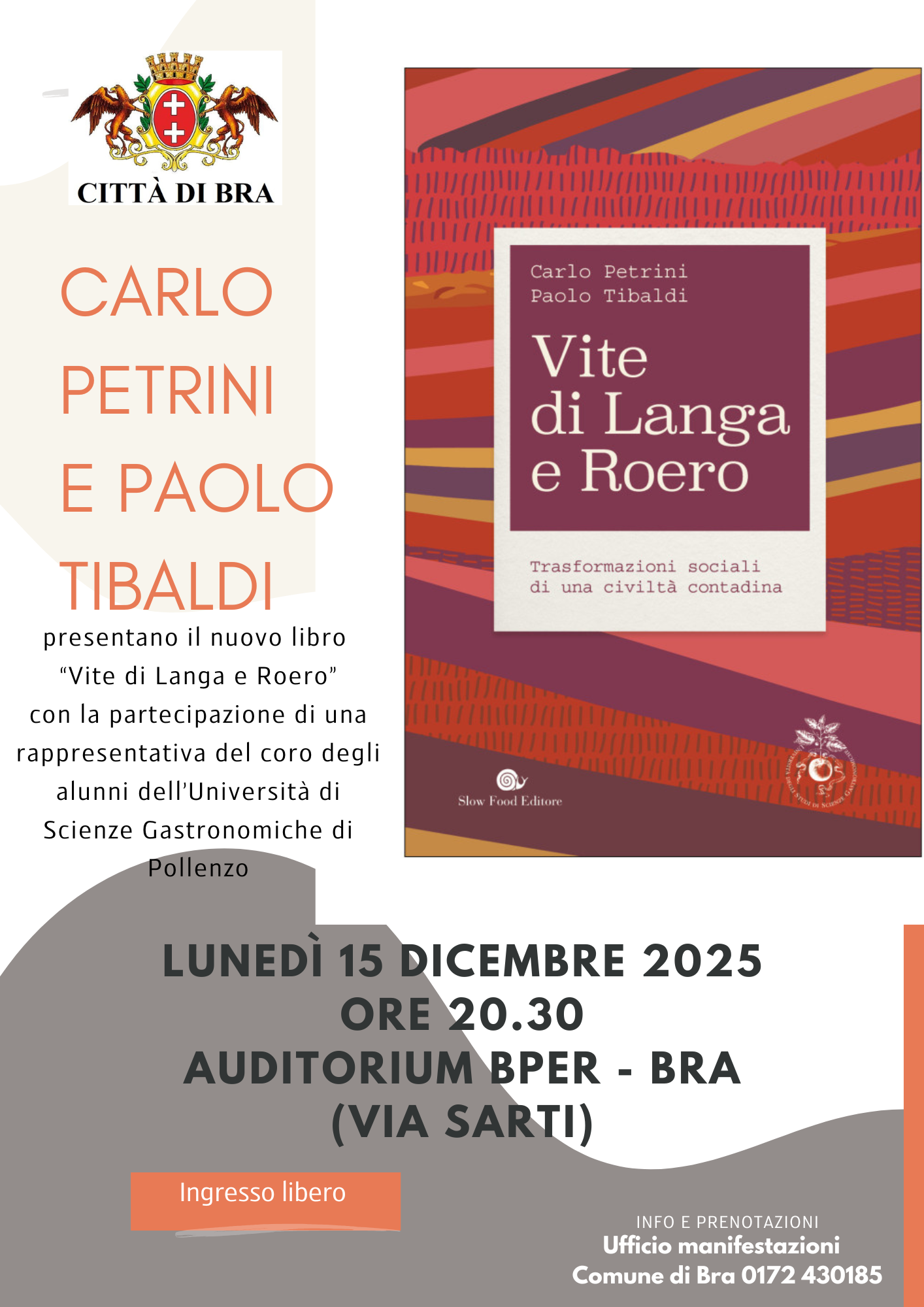 Lunedì 15 dicembre 2025 alle 20.30 all’Auditorium Bper di via Sarti a Bra si presenta il libro “Vite di Langa e Roero” edito da Slow Food. Intervengono, dopo i saluti da parte dell’Amministrazione Comunale di Bra che organizza l’evento, gli autori Carlo Petrini e Paolo Tibaldi. Partecipa alla serata una rappresentativa del coro degli alunni dell’Università di Scienze Gastronomiche di Pollenzo diretto da Mattia Savigliano.
